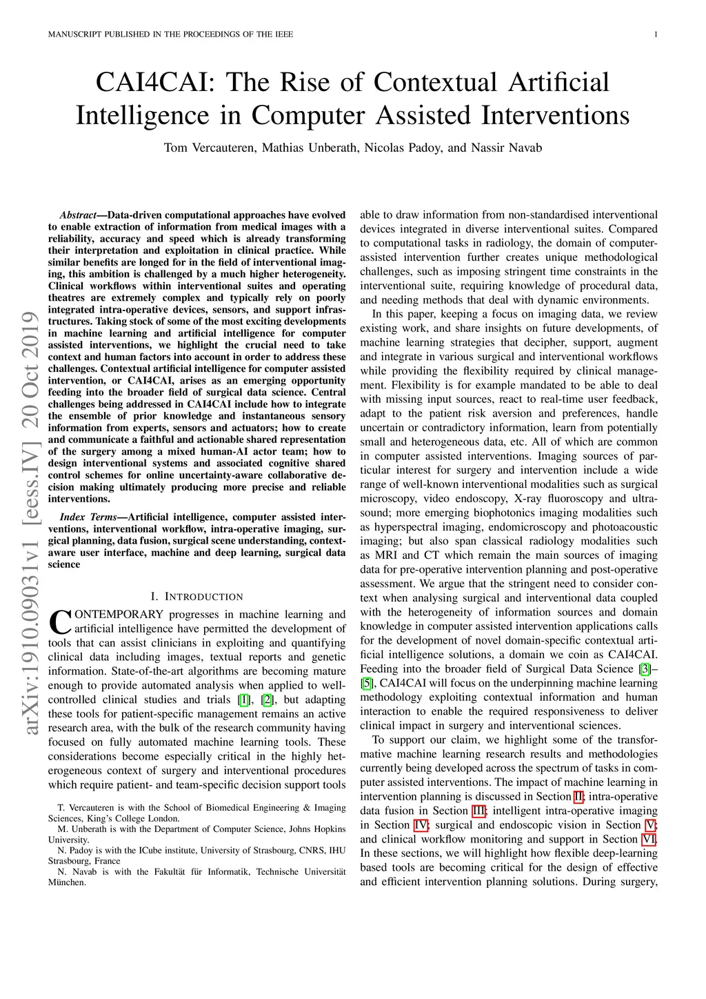 Data-driven computational approaches have evolved to enable extraction of information from medical images with a reliability, accuracy and speed which is already transforming their interpretation and exploitation in clinical practice. While similar benefits are longed for in the field of interventional imaging, this ambition is challenged by a much higher heterogeneity. Clinical workflows within interventional suites and operating theatres are extremely complex and typically rely on poorly integrated intra-operative devices, sensors, and support infrastructures. Taking stock of some of the most exciting developments in machine learning and artificial intelligence for computer assisted interventions, we highlight the crucial need to take context and human factors into account in order to address these challenges. Contextual artificial intelligence for computer assisted intervention, or CAI4CAI, arises as an emerging opportunity feeding into the broader field of surgical data science. Central challenges being addressed in CAI4CAI include how to integrate the ensemble of prior knowledge and instantaneous sensory information from experts, sensors and actuators; how to create and communicate a faithful and actionable shared representation of the surgery among a mixed human-AI actor team; how to design interventional systems and associated cognitive shared control schemes for online uncertainty-aware collaborative decision making ultimately producing more precise and reliable interventions.