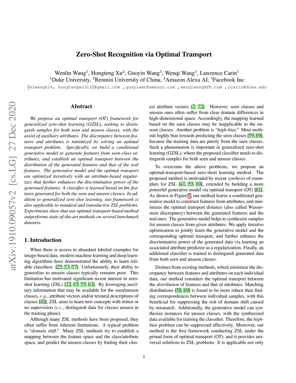 Zero-Shot Recognition via Optimal Transport