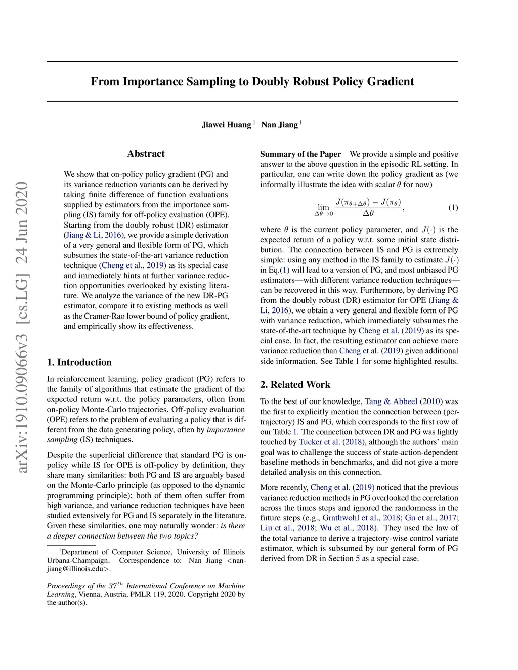 We show that on-policy policy gradient (PG) and its variance reduction variants can be derived by taking finite difference of function evaluations supplied by estimators from the importance sampling (IS) family for off-policy evaluation (OPE). Starting from the doubly robust (DR) estimator (Jiang & Li, 2016), we provide a simple derivation of a very general and flexible form of PG, which subsumes the state-of-the-art variance reduction technique (Cheng et al., 2019) as its special case and immediately hints at further variance reduction opportunities overlooked by existing literature. We analyze the variance of the new DR-PG estimator, compare it to existing methods as well as the Cramer-Rao lower bound of policy gradient, and empirically show its effectiveness.