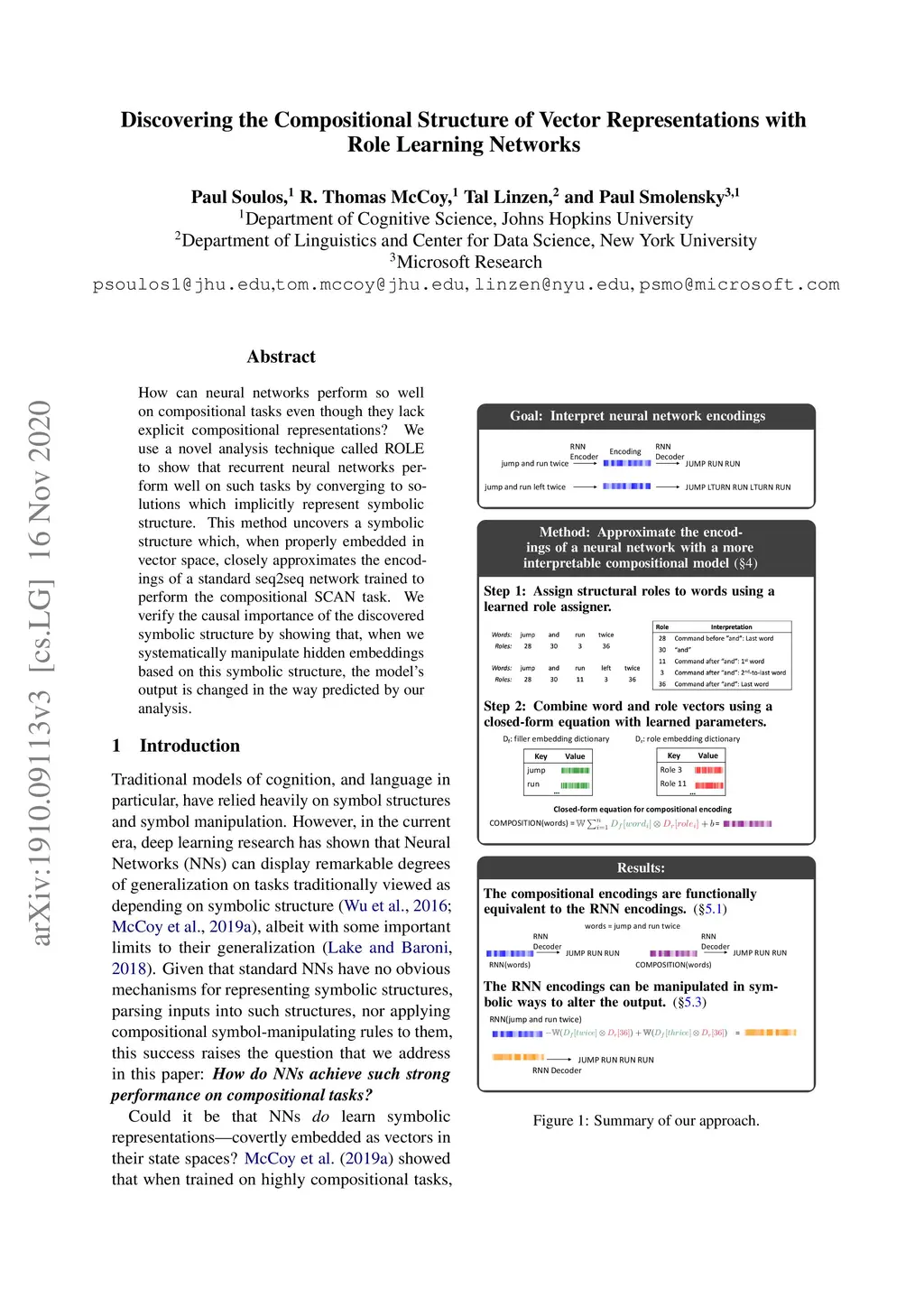 How can neural networks perform so well on compositional tasks even though they lack explicit compositional representations? We use a novel analysis technique called ROLE to show that recurrent neural networks perform well on such tasks by converging to solutions which implicitly represent symbolic structure. This method uncovers a symbolic structure which, when properly embedded in vector space, closely approximates the encodings of a standard seq2seq network trained to perform the compositional SCAN task. We verify the causal importance of the discovered symbolic structure by showing that, when we systematically manipulate hidden embeddings based on this symbolic structure, the model's output is changed in the way predicted by our analysis.