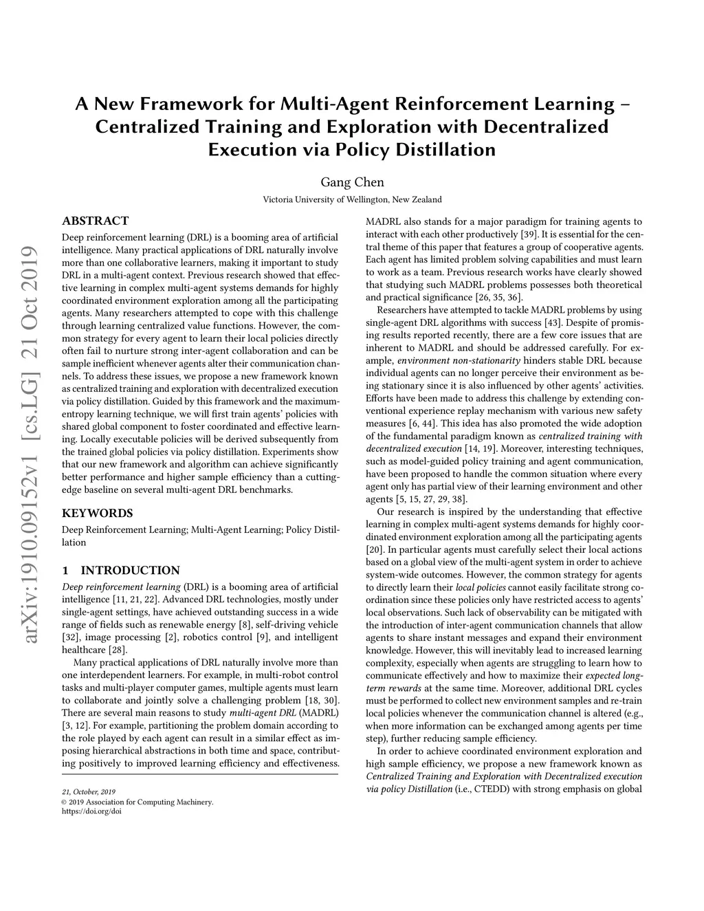 Deep reinforcement learning (DRL) is a booming area of artificial intelligence. Many practical applications of DRL naturally involve more than one collaborative learners, making it important to study DRL in a multi-agent context. Previous research showed that effective learning in complex multi-agent systems demands for highly coordinated environment exploration among all the participating agents. Many researchers attempted to cope with this challenge through learning centralized value functions. However, the common strategy for every agent to learn their local policies directly often fail to nurture strong inter-agent collaboration and can be sample inefficient whenever agents alter their communication channels. To address these issues, we propose a new framework known as centralized training and exploration with decentralized execution via policy distillation. Guided by this framework and the maximum-entropy learning technique, we will first train agents' policies with shared global component to foster coordinated and effective learning. Locally executable policies will be derived subsequently from the trained global policies via policy distillation. Experiments show that our new framework and algorithm can achieve significantly better performance and higher sample efficiency than a cutting-edge baseline on several multi-agent DRL benchmarks.