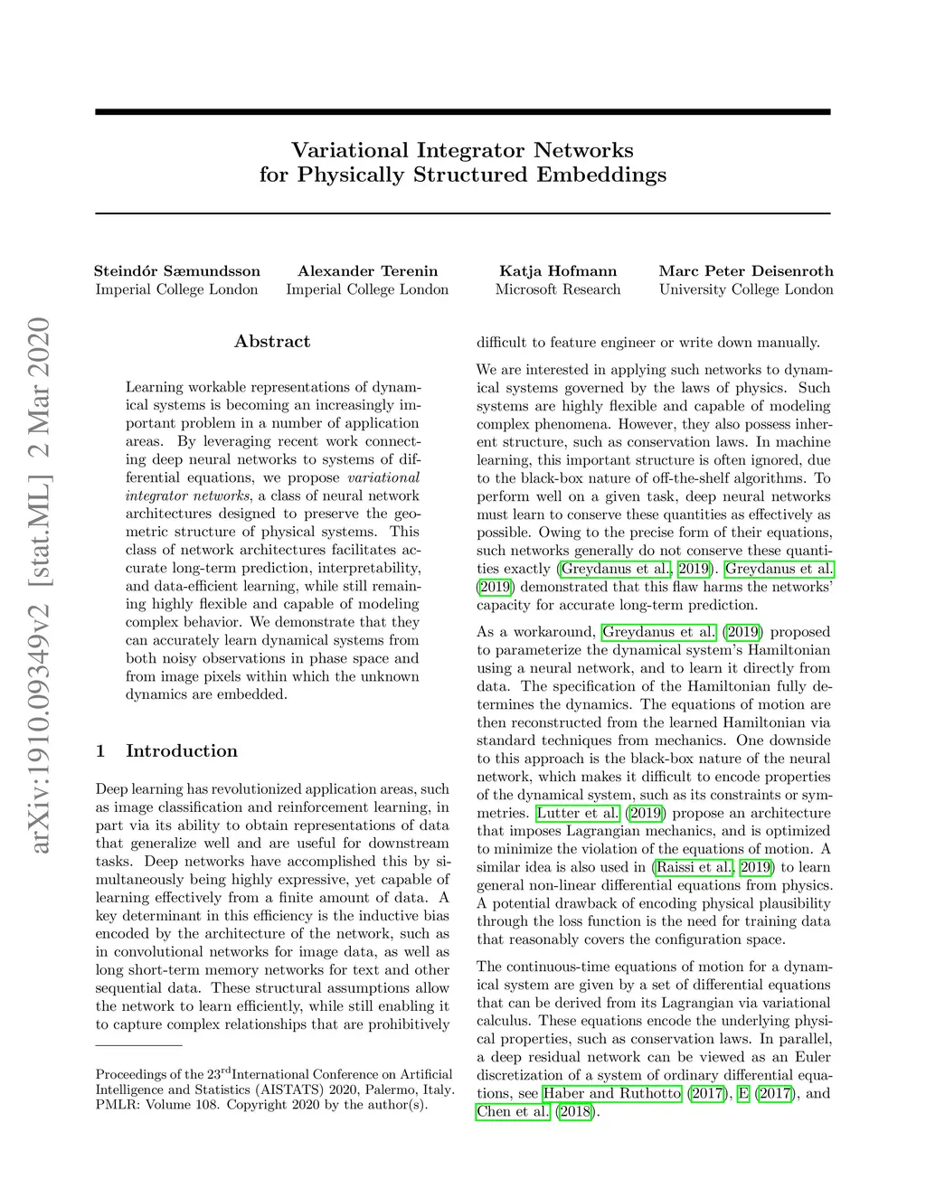 Learning workable representations of dynamical systems is becoming an increasingly important problem in a number of application areas. By leveraging recent work connecting deep neural networks to systems of differential equations, we propose \emph{variational integrator networks}, a class of neural network architectures designed to preserve the geometric structure of physical systems. This class of network architectures facilitates accurate long-term prediction, interpretability, and data-efficient learning, while still remaining highly flexible and capable of modeling complex behavior. We demonstrate that they can accurately learn dynamical systems from both noisy observations in phase space and from image pixels within which the unknown dynamics are embedded.