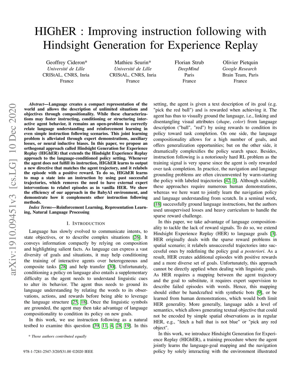 Language creates a compact representation of the world and allows the description of unlimited situations and objectives through compositionality. While these characterizations may foster instructing, conditioning or structuring interactive agent behavior, it remains an open-problem to correctly relate language understanding and reinforcement learning in even simple instruction following scenarios. This joint learning problem is alleviated through expert demonstrations, auxiliary losses, or neural inductive biases. In this paper, we propose an orthogonal approach called Hindsight Generation for Experience Replay (HIGhER) that extends the Hindsight Experience Replay (HER) approach to the language-conditioned policy setting. Whenever the agent does not fulfill its instruction, HIGhER learns to output a new directive that matches the agent trajectory, and it relabels the episode with a positive reward. To do so, HIGhER learns to map a state into an instruction by using past successful trajectories, which removes the need to have external expert interventions to relabel episodes as in vanilla HER. We show the efficiency of our approach in the BabyAI environment, and demonstrate how it complements other instruction following methods.