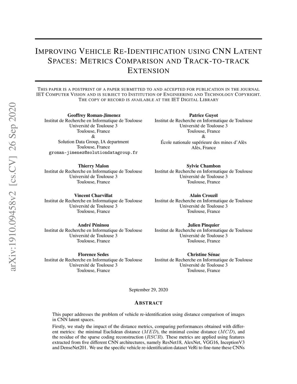 This paper addresses the problem of vehicle re-identification using distance comparison of images in CNN latent spaces. Firstly, we study the impact of the distance metrics, comparing performances obtained with different metrics: the minimal Euclidean distance (MED), the minimal cosine distance (MCD), and the residue of the sparse coding reconstruction (RSCR). These metrics are applied using features extracted from five different CNN architectures, namely ResNet18, AlexNet, VGG16, InceptionV3 and DenseNet201. We use the specific vehicle re-identification dataset VeRi to fine-tune these CNNs and evaluate results. In overall, independently of the CNN used, MCD outperforms MED, commonly used in the literature. These results are confirmed on other vehicle retrieval datasets. Secondly, we extend the state-of-the-art image-to-track process (I2TP) to a track-to-track process (T2TP). The three distance metrics are extended to measure distance between tracks, enabling T2TP. We compared T2TP with I2TP using the same CNN models. Results show that T2TP outperforms I2TP for MCD and RSCR. T2TP combining DenseNet201 and MCD-based metrics exhibits the best performances, outperforming the state-of-the-art I2TP-based models. Finally, experiments highlight two main results: i) the impact of metric choice in vehicle re-identification, and ii) T2TP improves the performances compared to I2TP, especially when coupled with MCD-based metrics.