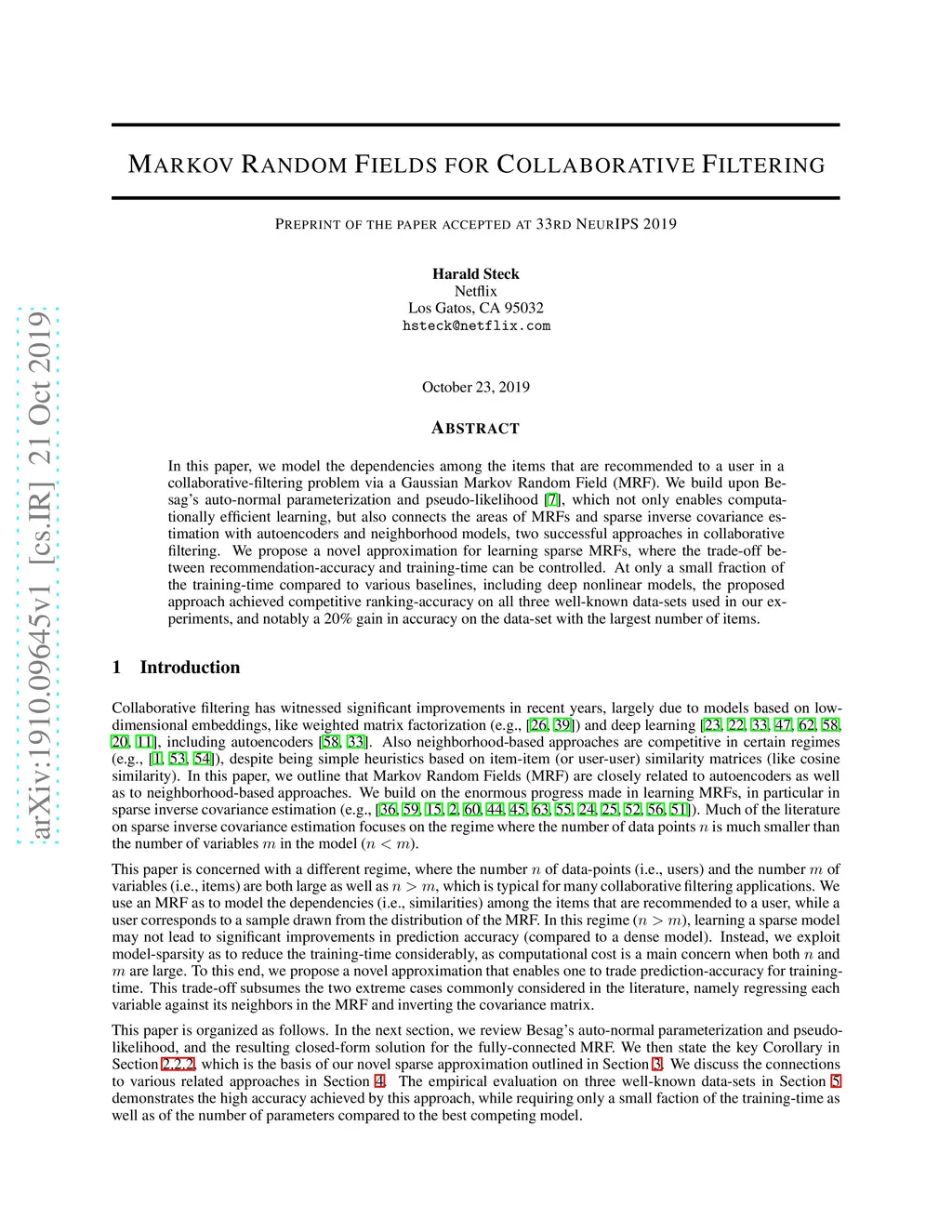 In this paper, we model the dependencies among the items that are recommended to a user in a collaborative-filtering problem via a Gaussian Markov Random Field (MRF). We build upon Besag's auto-normal parameterization and pseudo-likelihood, which not only enables computationally efficient learning, but also connects the areas of MRFs and sparse inverse covariance estimation with autoencoders and neighborhood models, two successful approaches in collaborative filtering. We propose a novel approximation for learning sparse MRFs, where the trade-off between recommendation-accuracy and training-time can be controlled. At only a small fraction of the training-time compared to various baselines, including deep nonlinear models, the proposed approach achieved competitive ranking-accuracy on all three well-known data-sets used in our experiments, and notably a 20% gain in accuracy on the data-set with the largest number of items.