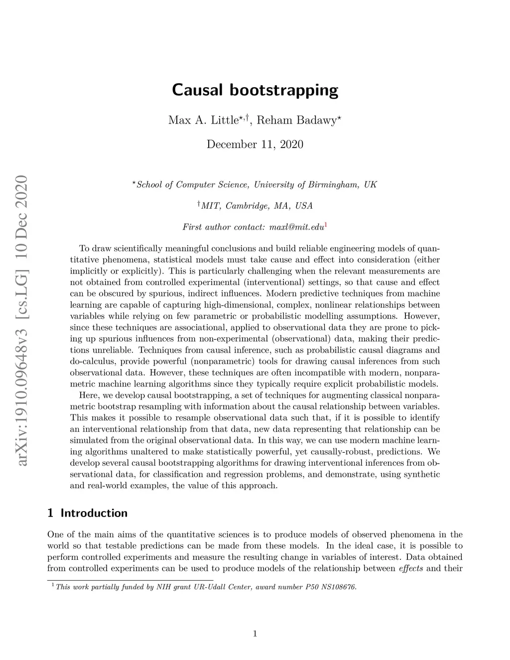 To draw scientifically meaningful conclusions and build reliable models of quantitative phenomena, cause and effect must be taken into consideration (either implicitly or explicitly). This is particularly challenging when the measurements are not from controlled experimental (interventional) settings, since cause and effect can be obscured by spurious, indirect influences. Modern predictive techniques from machine learning are capable of capturing high-dimensional, nonlinear relationships between variables while relying on few parametric or probabilistic model assumptions. However, since these techniques are associational, applied to observational data they are prone to picking up spurious influences from non-experimental (observational) data, making their predictions unreliable. Techniques from causal inference, such as probabilistic causal diagrams and do-calculus, provide powerful (nonparametric) tools for drawing causal inferences from such observational data. However, these techniques are often incompatible with modern, nonparametric machine learning algorithms since they typically require explicit probabilistic models. Here, we develop causal bootstrapping for augmenting classical nonparametric bootstrap resampling with information on the causal relationship between variables. This makes it possible to resample observational data such that, if it is possible to identify an interventional relationship from that data, new data representing that relationship can be simulated from the original observational data. In this way, we can use modern machine learning algorithms unaltered to make statistically powerful, yet causally-robust, predictions. We develop several causal bootstrapping algorithms for drawing interventional inferences from observational data, for classification and regression problems, and demonstrate, using synthetic and real-world examples, the value of this approach.