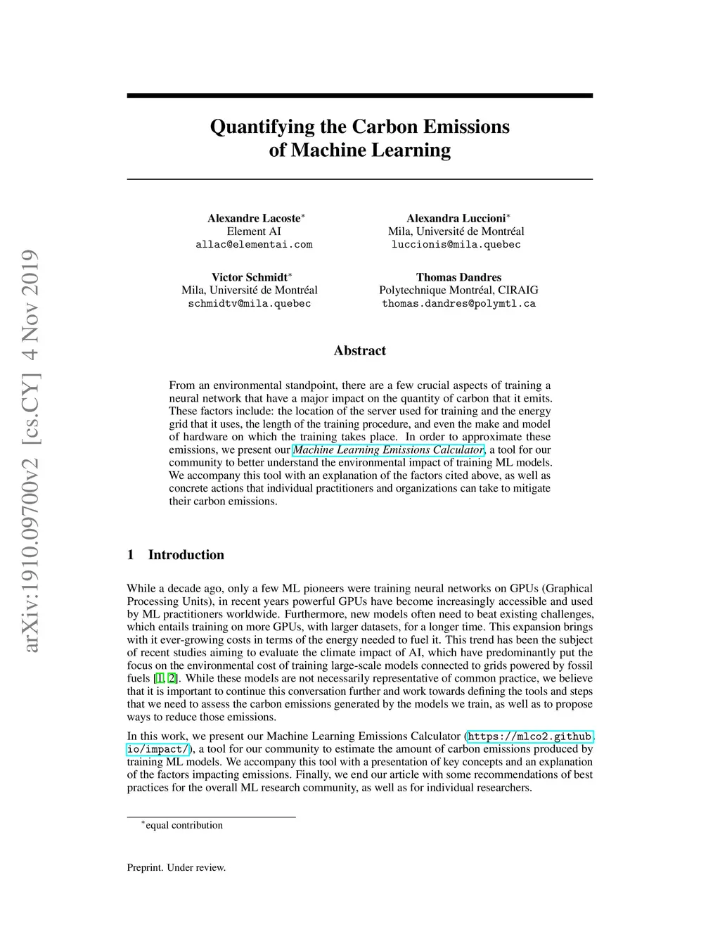 From an environmental standpoint, there are a few crucial aspects of training a neural network that have a major impact on the quantity of carbon that it emits. These factors include: the location of the server used for training and the energy grid that it uses, the length of the training procedure, and even the make and model of hardware on which the training takes place. In order to approximate these emissions, we present our Machine Learning Emissions Calculator, a tool for our community to better understand the environmental impact of training ML models. We accompany this tool with an explanation of the factors cited above, as well as concrete actions that individual practitioners and organizations can take to mitigate their carbon emissions.