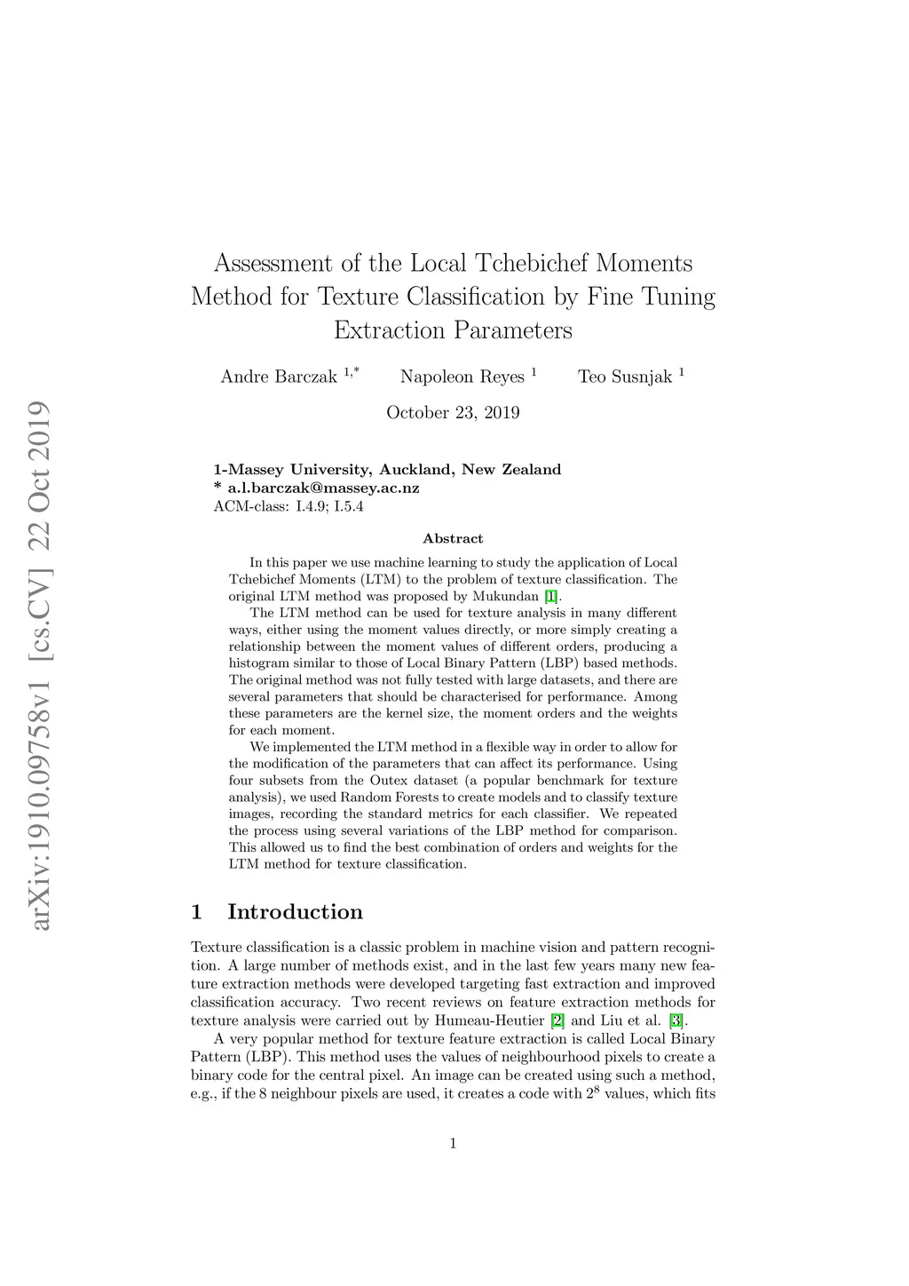 In this paper we use machine learning to study the application of Local Tchebichef Moments (LTM) to the problem of texture classification. The original LTM method was proposed by Mukundan (2014). The LTM method can be used for texture analysis in many different ways, either using the moment values directly, or more simply creating a relationship between the moment values of different orders, producing a histogram similar to those of Local Binary Pattern (LBP) based methods. The original method was not fully tested with large datasets, and there are several parameters that should be characterised for performance. Among these parameters are the kernel size, the moment orders and the weights for each moment. We implemented the LTM method in a flexible way in order to allow for the modification of the parameters that can affect its performance. Using four subsets from the Outex dataset (a popular benchmark for texture analysis), we used Random Forests to create models and to classify texture images, recording the standard metrics for each classifier. We repeated the process using several variations of the LBP method for comparison. This allowed us to find the best combination of orders and weights for the LTM method for texture classification.