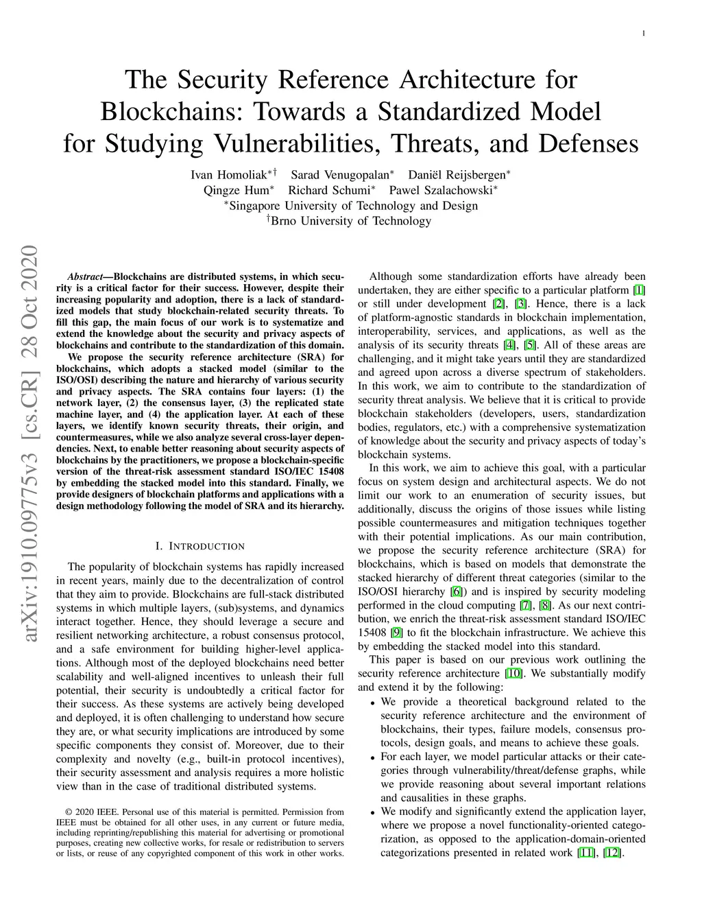 Blockchains are distributed systems, in which security is a critical factor for their success. However, despite their increasing popularity and adoption, there is a lack of standardized models that study blockchain-related security threats. To fill this gap, the main focus of our work is to systematize and extend the knowledge about the security and privacy aspects of blockchains and contribute to the standardization of this domain. We propose the security reference architecture (SRA) for blockchains, which adopts a stacked model (similar to the ISO/OSI) describing the nature and hierarchy of various security and privacy aspects. The SRA contains four layers: (1) the network layer, (2) the consensus layer, (3) the replicated state machine layer, and (4) the application layer. At each of these layers, we identify known security threats, their origin, and countermeasures, while we also analyze several cross-layer dependencies. Next, to enable better reasoning about security aspects of blockchains by the practitioners, we propose a blockchain-specific version of the threat-risk assessment standard ISO/IEC 15408 by embedding the stacked model into this standard. Finally, we provide designers of blockchain platforms and applications with a design methodology following the model of SRA and its hierarchy.