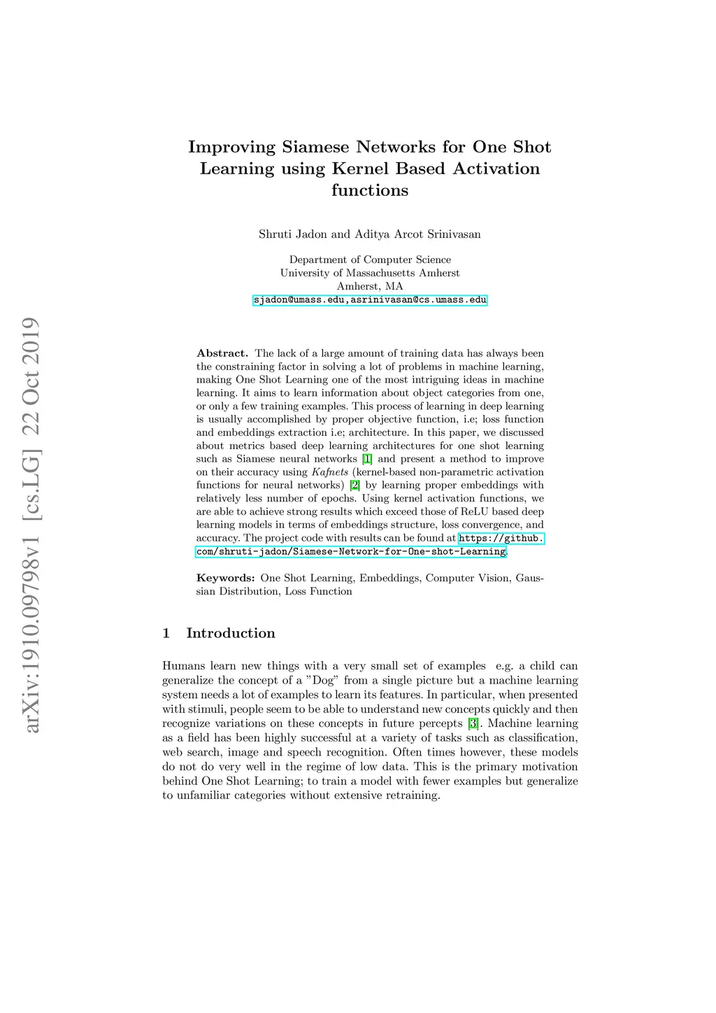The lack of a large amount of training data has always been the constraining factor in solving a lot of problems in machine learning, making One Shot Learning one of the most intriguing ideas in machine learning. It aims to learn information about object categories from one, or only a few training examples. This process of learning in deep learning is usually accomplished by proper objective function, i.e; loss function and embeddings extraction i.e; architecture. In this paper, we discussed about metrics based deep learning architectures for one shot learning such as Siamese neural networks and present a method to improve on their accuracy using Kafnets (kernel-based non-parametric activation functions for neural networks) by learning proper embeddings with relatively less number of epochs. Using kernel activation functions, we are able to achieve strong results which exceed those of ReLU based deep learning models in terms of embeddings structure, loss convergence, and accuracy.