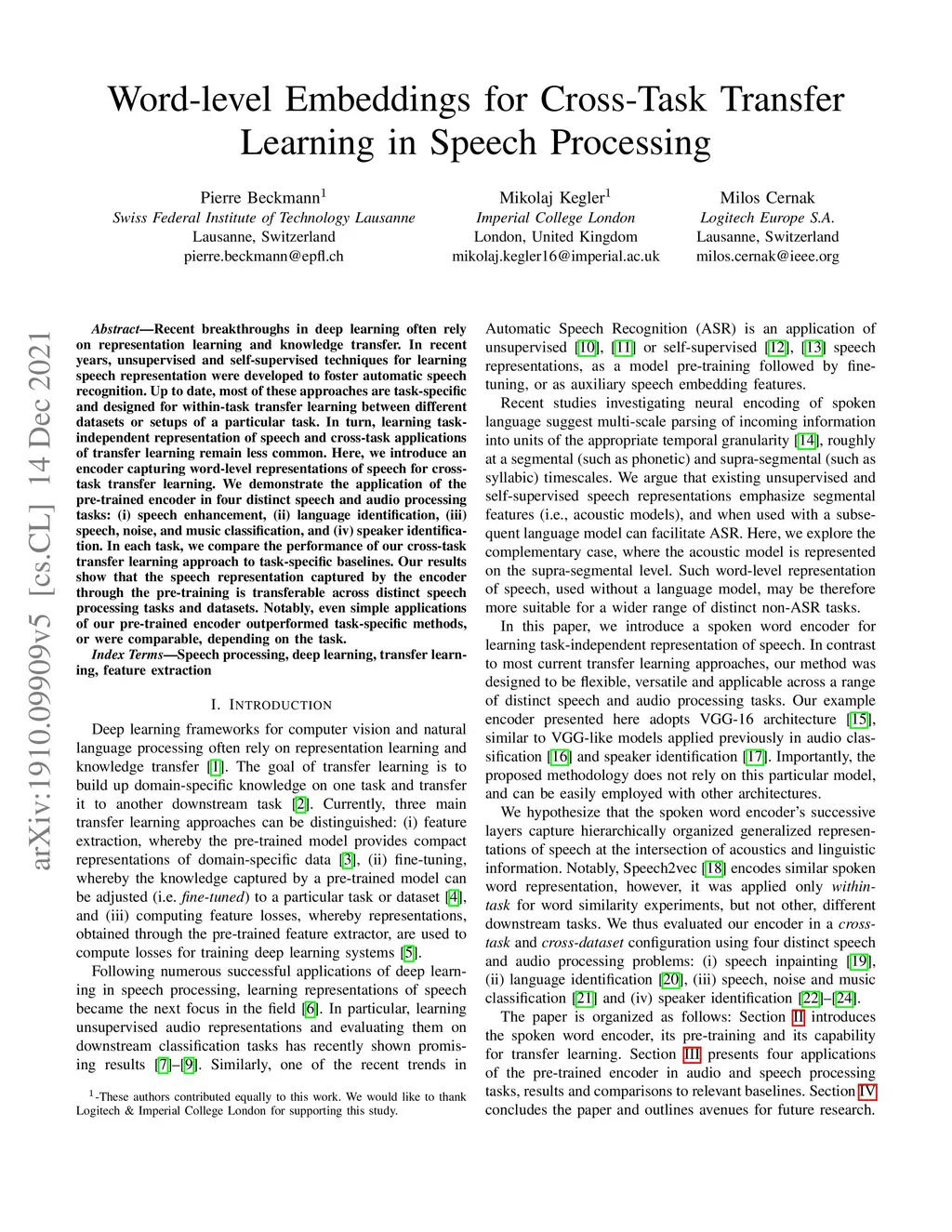 Word-level Embeddings for Cross-Task Transfer Learning in Speech