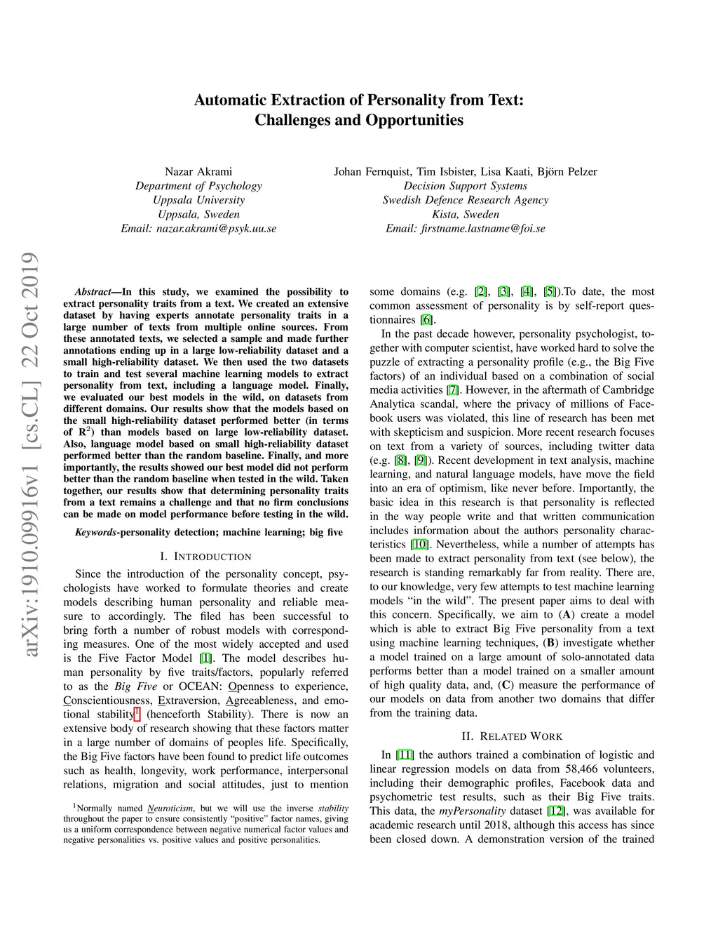 In this study, we examined the possibility to extract personality traits from a text. We created an extensive dataset by having experts annotate personality traits in a large number of texts from multiple online sources. From these annotated texts, we selected a sample and made further annotations ending up in a large low-reliability dataset and a small high-reliability dataset. We then used the two datasets to train and test several machine learning models to extract personality from text, including a language model. Finally, we evaluated our best models in the wild, on datasets from different domains. Our results show that the models based on the small high-reliability dataset performed better (in terms of ) than models based on large low-reliability dataset. Also, language model based on small high-reliability dataset performed better than the random baseline. Finally, and more importantly, the results showed our best model did not perform better than the random baseline when tested in the wild. Taken together, our results show that determining personality traits from a text remains a challenge and that no firm conclusions can be made on model performance before testing in the wild.