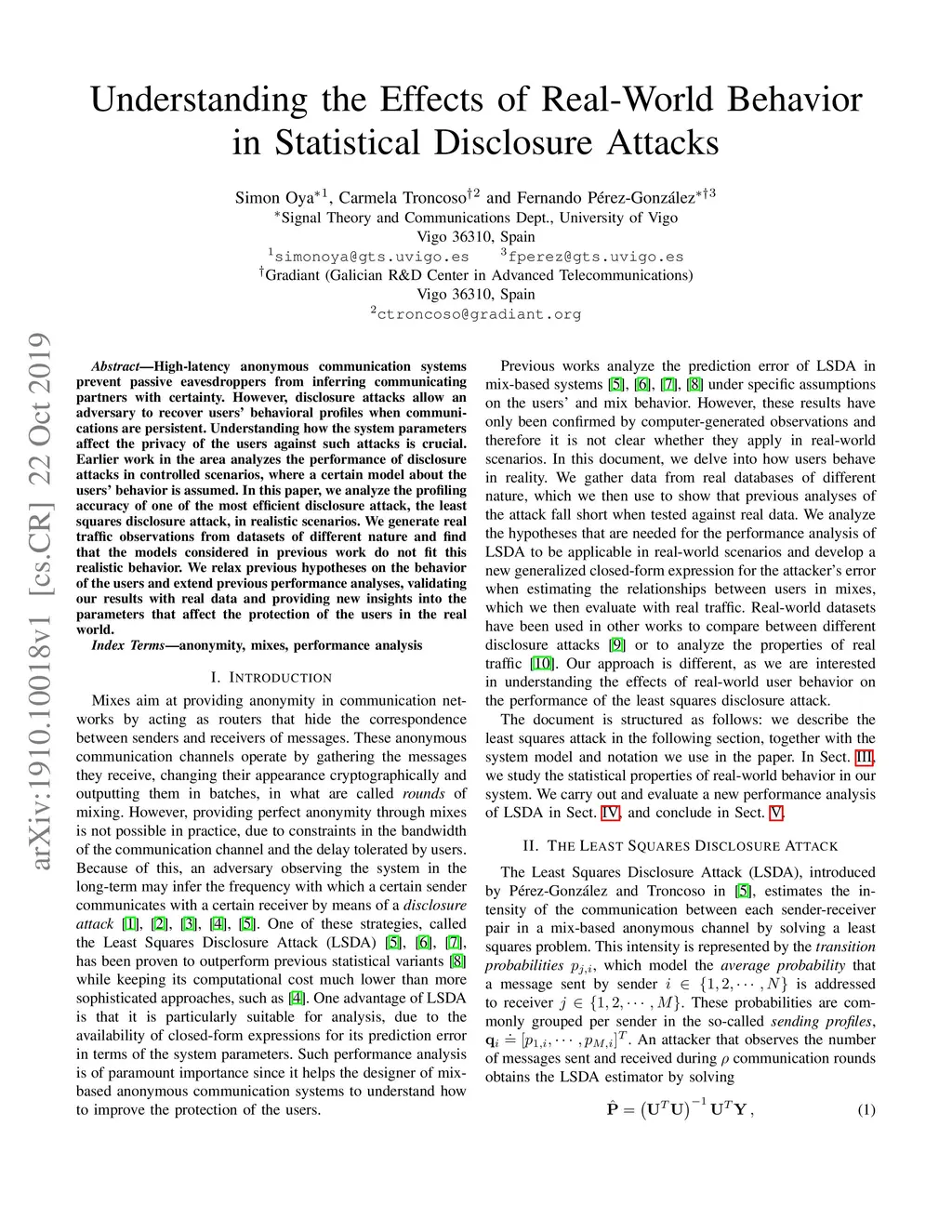 High-latency anonymous communication systems prevent passive eavesdroppers from inferring communicating partners with certainty. However, disclosure attacks allow an adversary to recover users' behavioral profiles when communications are persistent. Understanding how the system parameters affect the privacy of the users against such attacks is crucial. Earlier work in the area analyzes the performance of disclosure attacks in controlled scenarios, where a certain model about the users' behavior is assumed. In this paper, we analyze the profiling accuracy of one of the most efficient disclosure attack, the least squares disclosure attack, in realistic scenarios. We generate real traffic observations from datasets of different nature and find that the models considered in previous work do not fit this realistic behavior. We relax previous hypotheses on the behavior of the users and extend previous performance analyses, validating our results with real data and providing new insights into the parameters that affect the protection of the users in the real world.