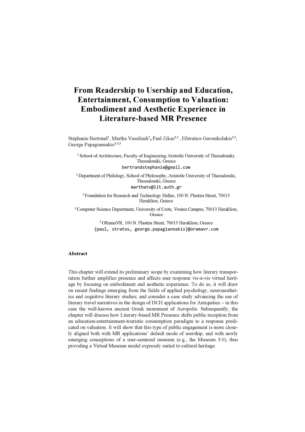 This chapter will extend its preliminary scope by examining how literary transportation further amplifies presence and affects user response vis-\á-vis virtual heritage by focusing on embodiment and aesthetic experience. To do so, it will draw on recent findings emerging from the fields of applied psychology, neuroaesthetics and cognitive literary studies; and consider a case study advancing the use of literary travel narratives in the design of DCH applications for Antiquities - in this case the well-known ancient Greek monument of Acropolis. Subsequently, the chapter will discuss how Literary-based MR Presence shifts public reception from an education-entertainment-touristic consumption paradigm to a response predicated on valuation. It will show that this type of public engagement is more closely aligned both with MR applications' default mode of usership, and with newly emerging conceptions of a user-centered museum (e.g., the Museum 3.0), thus providing a Virtual Museum model expressly suited to cultural heritage.