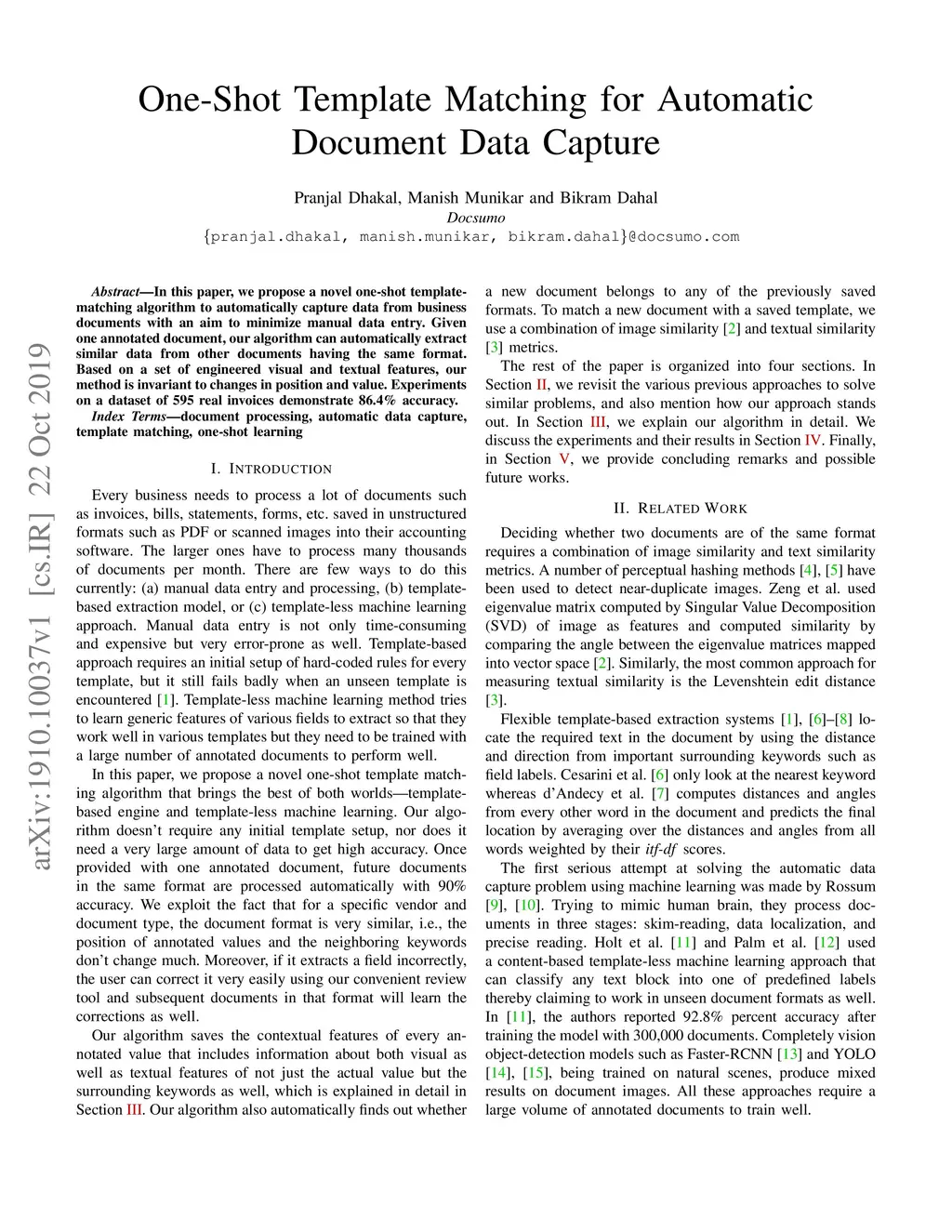 In this paper, we propose a novel one-shot template-matching algorithm to automatically capture data from business documents with an aim to minimize manual data entry. Given one annotated document, our algorithm can automatically extract similar data from other documents having the same format. Based on a set of engineered visual and textual features, our method is invariant to changes in position and value. Experiments on a dataset of 595 real invoices demonstrate 86.4% accuracy.