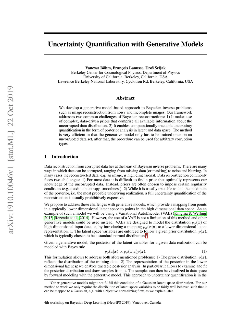 We develop a generative model-based approach to Bayesian inverse problems, such as image reconstruction from noisy and incomplete images. Our framework addresses two common challenges of Bayesian reconstructions: 1) It makes use of complex, data-driven priors that comprise all available information about the uncorrupted data distribution. 2) It enables computationally tractable uncertainty quantification in the form of posterior analysis in latent and data space. The method is very efficient in that the generative model only has to be trained once on an uncorrupted data set, after that, the procedure can be used for arbitrary corruption types.