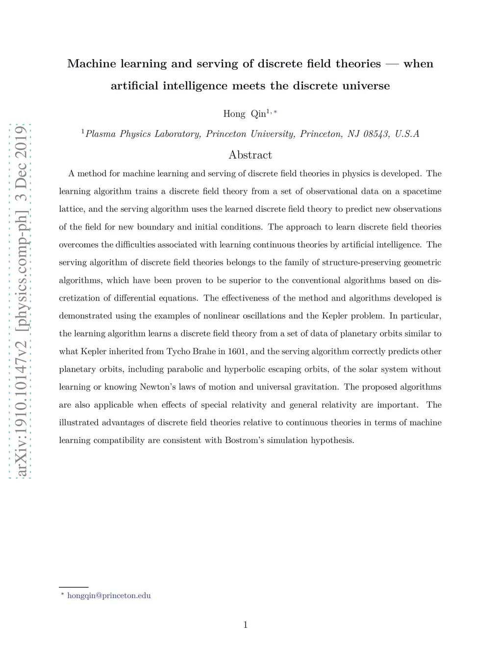 A method for machine learning and serving of discrete field theories in physics is developed. The learning algorithm trains a discrete field theory from a set of observational data on a spacetime lattice, and the serving algorithm uses the learned discrete field theory to predict new observations of the field for new boundary and initial conditions. The approach to learn discrete field theories overcomes the difficulties associated with learning continuous theories by artificial intelligence. The serving algorithm of discrete field theories belongs to the family of structure-preserving geometric algorithms, which have been proven to be superior to the conventional algorithms based on discretization of differential equations. The effectiveness of the method and algorithms developed is demonstrated using the examples of nonlinear oscillations and the Kepler problem. In particular, the learning algorithm learns a discrete field theory from a set of data of planetary orbits similar to what Kepler inherited from Tycho Brahe in 1601, and the serving algorithm correctly predicts other planetary orbits, including parabolic and hyperbolic escaping orbits, of the solar system without learning or knowing Newton's laws of motion and universal gravitation. The proposed algorithms are also applicable when effects of special relativity and general relativity are important. The illustrated advantages of discrete field theories relative to continuous theories in terms of machine learning compatibility are consistent with Bostrom's simulation hypothesis.
