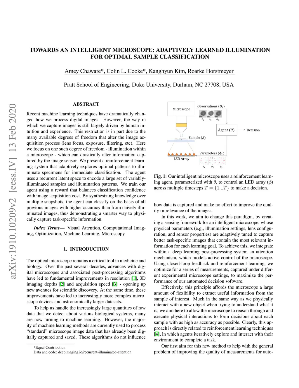 Recent machine learning techniques have dramatically changed how we process digital images. However, the way in which we capture images is still largely driven by human intuition and experience. This restriction is in part due to the many available degrees of freedom that alter the image acquisition process (lens focus, exposure, filtering, etc). Here we focus on one such degree of freedom - illumination within a microscope - which can drastically alter information captured by the image sensor. We present a reinforcement learning system that adaptively explores optimal patterns to illuminate specimens for immediate classification. The agent uses a recurrent latent space to encode a large set of variably-illuminated samples and illumination patterns. We train our agent using a reward that balances classification confidence with image acquisition cost. By synthesizing knowledge over multiple snapshots, the agent can classify on the basis of all previous images with higher accuracy than from naively illuminated images, thus demonstrating a smarter way to physically capture task-specific information.