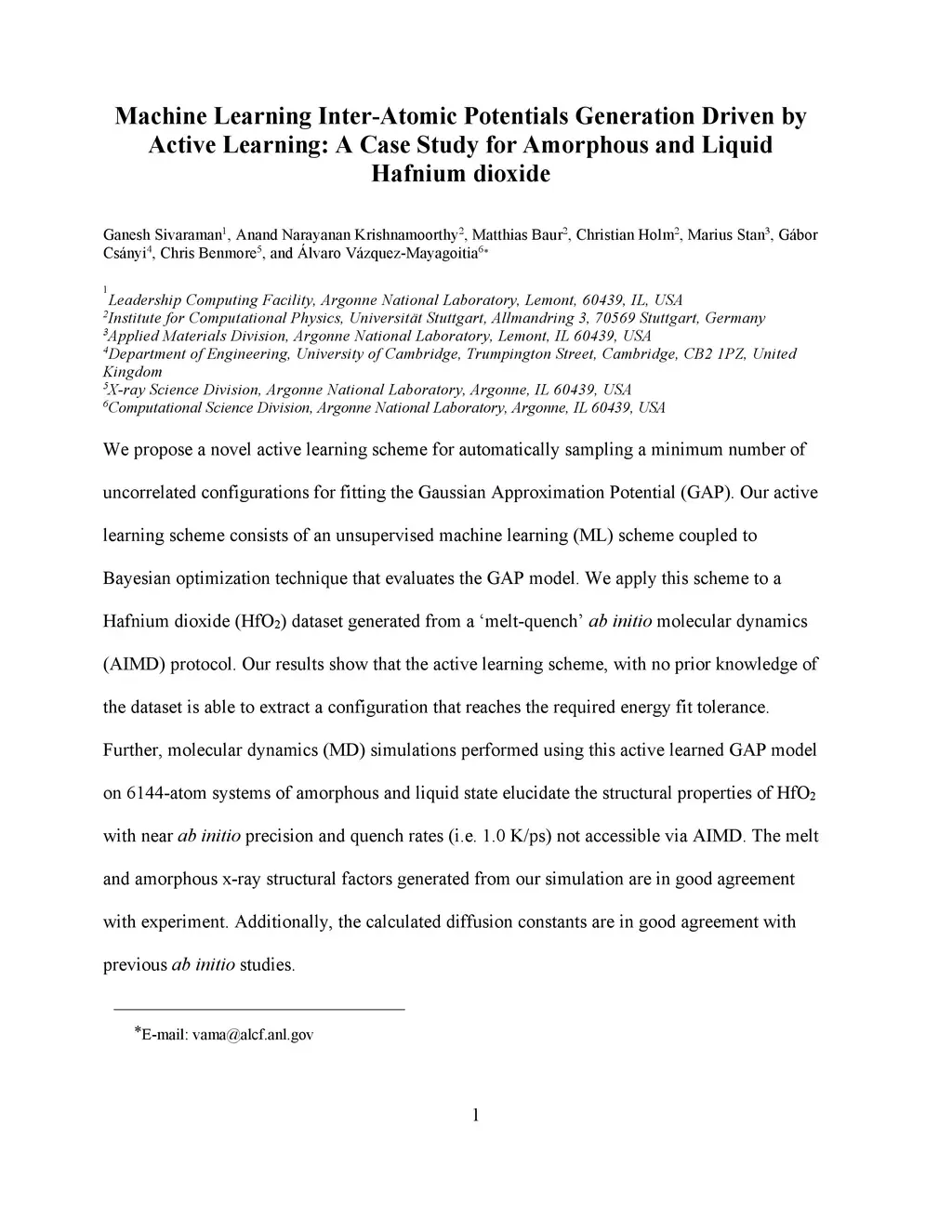 We propose a novel active learning scheme for automatically sampling a minimum number of uncorrelated configurations for fitting the Gaussian Approximation Potential (GAP). Our active learning scheme consists of an unsupervised machine learning (ML) scheme coupled to Bayesian optimization technique that evaluates the GAP model. We apply this scheme to a Hafnium dioxide (HfO2) dataset generated from a melt-quench ab initio molecular dynamics (AIMD) protocol. Our results show that the active learning scheme, with no prior knowledge of the dataset is able to extract a configuration that reaches the required energy fit tolerance. Further, molecular dynamics (MD) simulations performed using this active learned GAP model on 6144-atom systems of amorphous and liquid state elucidate the structural properties of HfO2 with near ab initio precision and quench rates (i.e. 1.0 K/ps) not accessible via AIMD. The melt and amorphous x-ray structural factors generated from our simulation are in good agreement with experiment. Additionally, the calculated diffusion constants are in good agreement with previous ab initio studies.