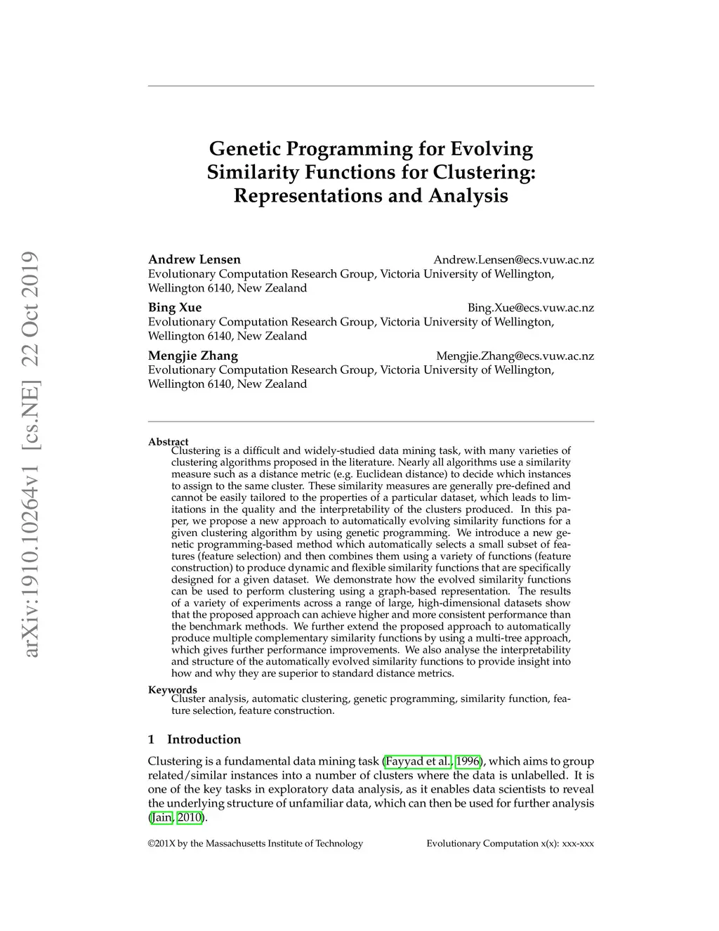 Genetic Programming for Evolving Similarity Functions for Clustering: