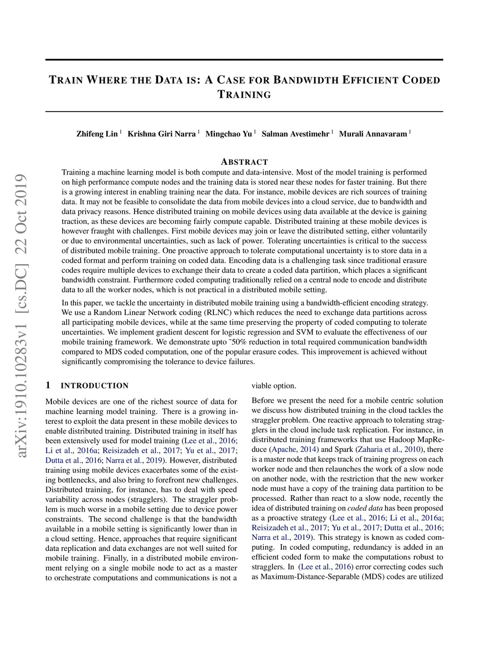 Training a machine learning model is both compute and data-intensive. Most of the model training is performed on high performance compute nodes and the training data is stored near these nodes for faster training. But there is a growing interest in enabling training near the data. For instance, mobile devices are rich sources of training data. It may not be feasible to consolidate the data from mobile devices into a cloud service, due to bandwidth and data privacy reasons. Training at mobile devices is however fraught with challenges. First mobile devices may join or leave the distributed setting, either voluntarily or due to environmental uncertainties, such as lack of power. Tolerating uncertainties is critical to the success of distributed mobile training. One proactive approach to tolerate computational uncertainty is to store data in a coded format and perform training on coded data. Encoding data is a challenging task since erasure codes require multiple devices to exchange their data to create a coded data partition, which places a significant bandwidth constraint. Furthermore, coded computing traditionally relied on a central node to encode and distribute data to all the worker nodes, which is not practical in a distributed mobile setting. In this paper, we tackle the uncertainty in distributed mobile training using a bandwidth-efficient encoding strategy. We use a Random Linear Network coding (RLNC) which reduces the need to exchange data partitions across all participating mobile devices, while at the same time preserving the property of coded computing to tolerate uncertainties. We implement gradient descent for logistic regression and SVM to evaluate the effectiveness of our mobile training framework. We demonstrate a 50% reduction in total required communication bandwidth compared to MDS coded computation, one of the popular erasure codes.