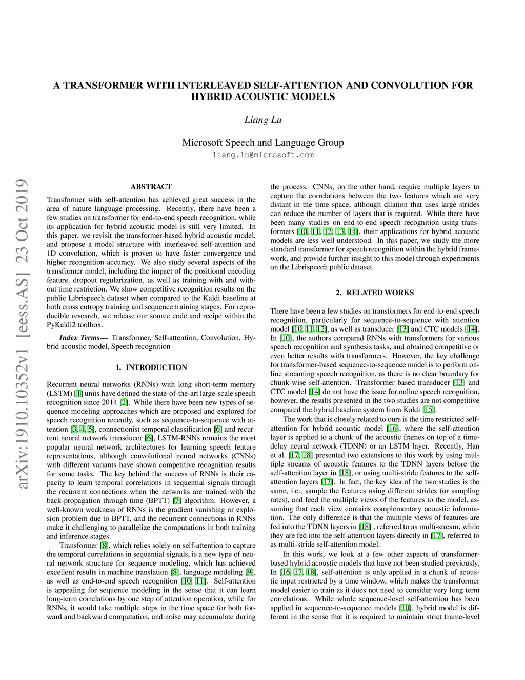 Transformer with self-attention has achieved great success in the area of nature language processing. Recently, there have been a few studies on transformer for end-to-end speech recognition, while its application for hybrid acoustic model is still very limited. In this paper, we revisit the transformer-based hybrid acoustic model, and propose a model structure with interleaved self-attention and 1D convolution, which is proven to have faster convergence and higher recognition accuracy. We also study several aspects of the transformer model, including the impact of the positional encoding feature, dropout regularization, as well as training with and without time restriction. We show competitive recognition results on the public Librispeech dataset when compared to the Kaldi baseline at both cross entropy training and sequence training stages. For reproducible research, we release our source code and recipe within the PyKaldi2 toolbox.