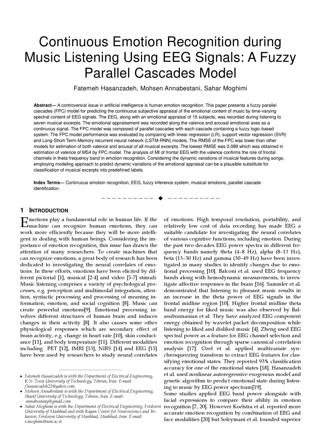 A controversial issue in artificial intelligence is human emotion recognition. This paper presents a fuzzy parallel cascades (FPC) model for predicting the continuous subjective appraisal of the emotional content of music by time-varying spectral content of EEG signals. The EEG, along with an emotional appraisal of 15 subjects, was recorded during listening to seven musical excerpts. The emotional appraisement was recorded along the valence and arousal emotional axes as a continuous signal. The FPC model was composed of parallel cascades with each cascade containing a fuzzy logic-based system. The FPC model performance was evaluated by comparing with linear regression (LR), support vector regression (SVR) and Long Short Term Memory recurrent neural network (LSTM RNN) models. The RMSE of the FPC was lower than other models for the estimation of both valence and arousal of all musical excerpts. The lowest RMSE was 0.089 which was obtained in estimation of the valence of MS4 by the FPC model. The analysis of MI of frontal EEG with the valence confirms the role of frontal channels in theta frequency band in emotion recognition. Considering the dynamic variations of musical features during songs, employing a modeling approach to predict dynamic variations of the emotional appraisal can be a plausible substitute for the classification of musical excerpts into predefined labels.
