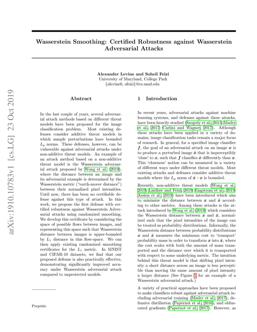 In the last couple of years, several adversarial attack methods based on different threat models have been proposed for the image classification problem. Most existing defenses consider additive threat models in which sample perturbations have bounded L_p norms. These defenses, however, can be vulnerable against adversarial attacks under non-additive threat models. An example of an attack method based on a non-additive threat model is the Wasserstein adversarial attack proposed by Wong et al. (2019), where the distance between an image and its adversarial example is determined by the Wasserstein metric ("earth-mover distance") between their normalized pixel intensities. Until now, there has been no certifiable defense against this type of attack. In this work, we propose the first defense with certified robustness against Wasserstein Adversarial attacks using randomized smoothing. We develop this certificate by considering the space of possible flows between images, and representing this space such that Wasserstein distance between images is upper-bounded by L_1 distance in this flow-space. We can then apply existing randomized smoothing certificates for the L_1 metric. In MNIST and CIFAR-10 datasets, we find that our proposed defense is also practically effective, demonstrating significantly improved accuracy under Wasserstein adversarial attack compared to unprotected models.