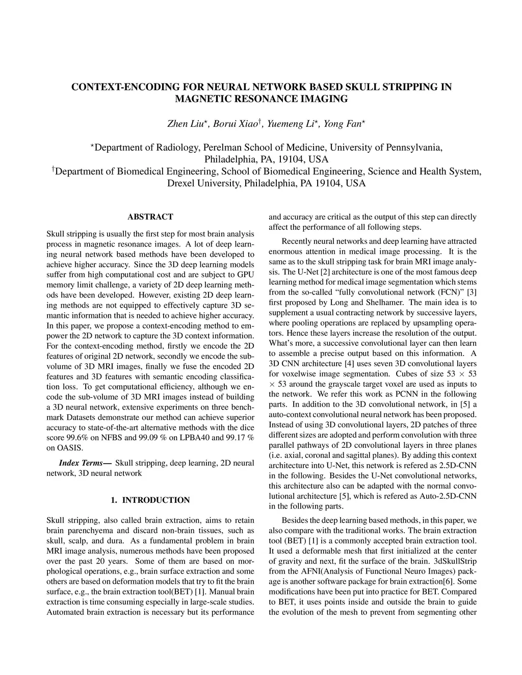 Skull stripping is usually the first step for most brain analysisprocess in magnetic resonance images. A lot of deep learn-ing neural network based methods have been developed toachieve higher accuracy. Since the 3D deep learning modelssuffer from high computational cost and are subject to GPUmemory limit challenge, a variety of 2D deep learning meth-ods have been developed. However, existing 2D deep learn-ing methods are not equipped to effectively capture 3D se-mantic information that is needed to achieve higher accuracy.In this paper, we propose a context-encoding method to em-power the 2D network to capture the 3D context information.For the context-encoding method, firstly we encode the 2Dfeatures of original 2D network, secondly we encode the sub-volume of 3D MRI images, finally we fuse the encoded 2Dfeatures and 3D features with semantic encoding classifica-tion loss. To get computational efficiency, although we en-code the sub-volume of 3D MRI images instead of buildinga 3D neural network, extensive experiments on three bench-mark Datasets demonstrate our method can achieve superioraccuracy to state-of-the-art alternative methods with the dicescore 99.6% on NFBS and 99.09 % on LPBA40 and 99.17 %on OASIS.