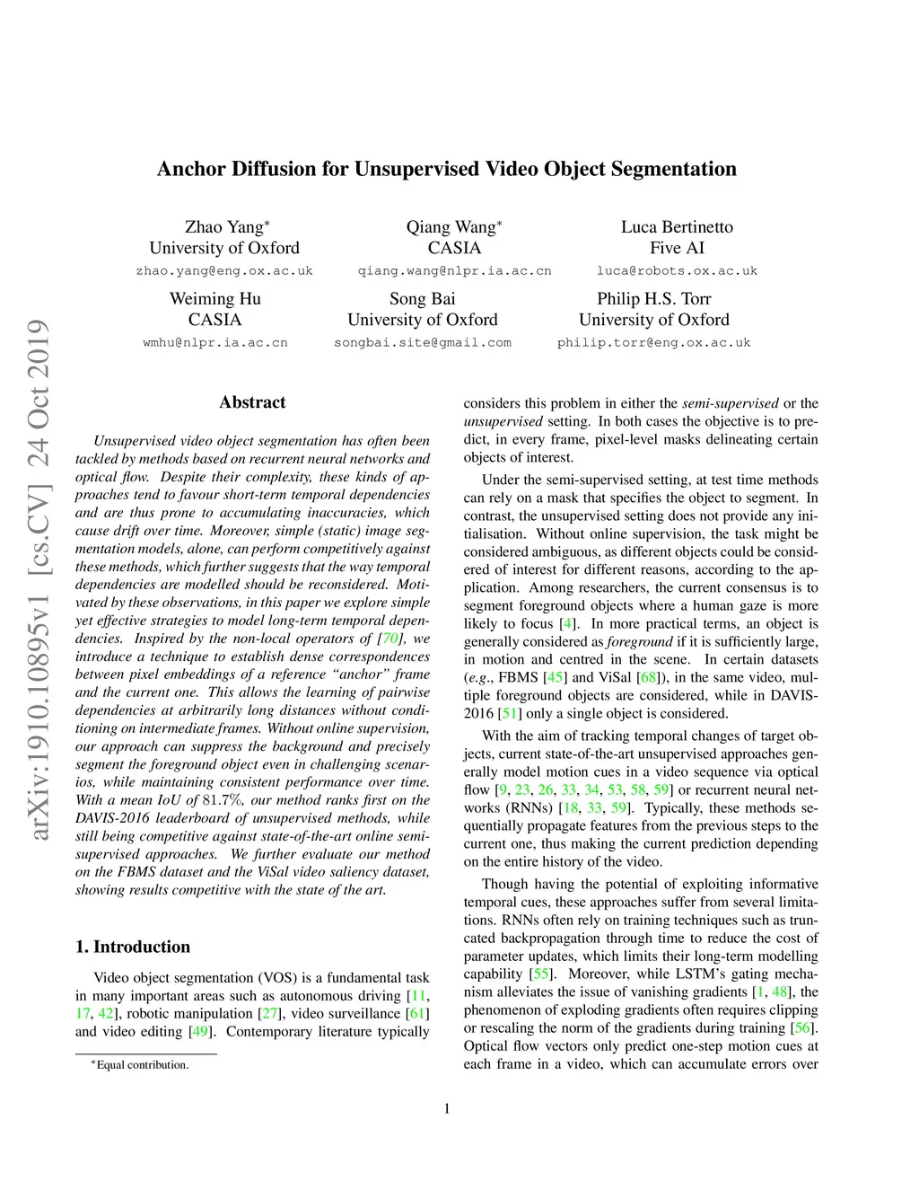 Anchor Diffusion for Unsupervised Video Object Segmentation