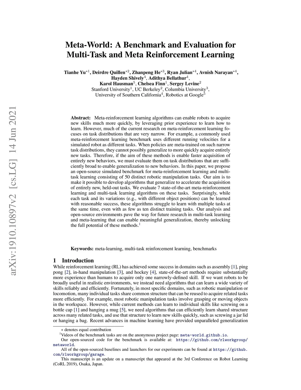 Meta-World: A Benchmark and Evaluation for Multi-Task and Meta