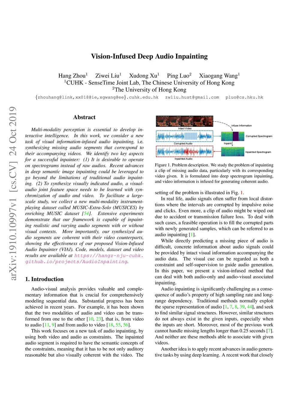 Multi-modality perception is essential to develop interactive intelligence. In this work, we consider a new task of visual information-infused audio inpainting, \ie synthesizing missing audio segments that correspond to their accompanying videos. We identify two key aspects for a successful inpainter: (1) It is desirable to operate on spectrograms instead of raw audios. Recent advances in deep semantic image inpainting could be leveraged to go beyond the limitations of traditional audio inpainting. (2) To synthesize visually indicated audio, a visual-audio joint feature space needs to be learned with synchronization of audio and video. To facilitate a large-scale study, we collect a new multi-modality instrument-playing dataset called MUSIC-Extra-Solo (MUSICES) by enriching MUSIC dataset. Extensive experiments demonstrate that our framework is capable of inpainting realistic and varying audio segments with or without visual contexts. More importantly, our synthesized audio segments are coherent with their video counterparts, showing the effectiveness of our proposed Vision-Infused Audio Inpainter (VIAI). Code, models, dataset and video results are available at https://hangz-nju-cuhk.github.io/projects/AudioInpainting