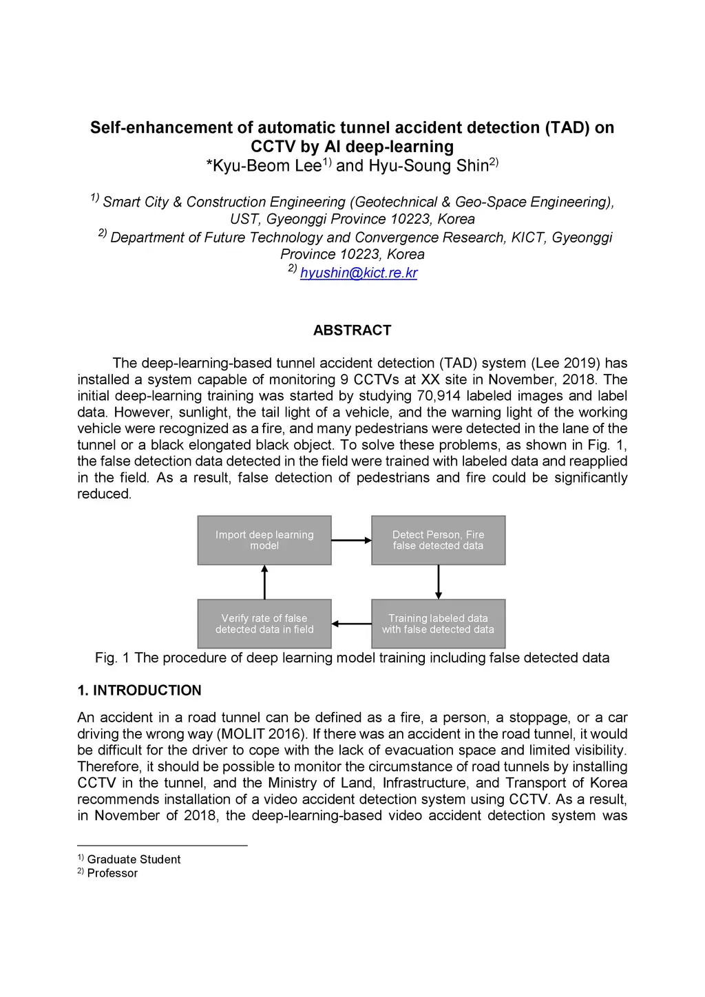 The deep-learning-based tunnel accident detection (TAD) system (Lee 2019) has installed a system capable of monitoring 9 CCTVs at XX site in November, 2018. The initial deep-learning training was started by studying 70,914 labeled images and label data. However, sunlight, the tail light of a vehicle, and the warning light of the working vehicle were recognized as a fire, and many pedestrians were detected in the lane of the tunnel or a black elongated black object. To solve these problems, as shown in Fig. 1, the false detection data detected in the field were trained with labeled data and reapplied in the field. As a result, false detection of pedestrians and fire could be significantly reduced.