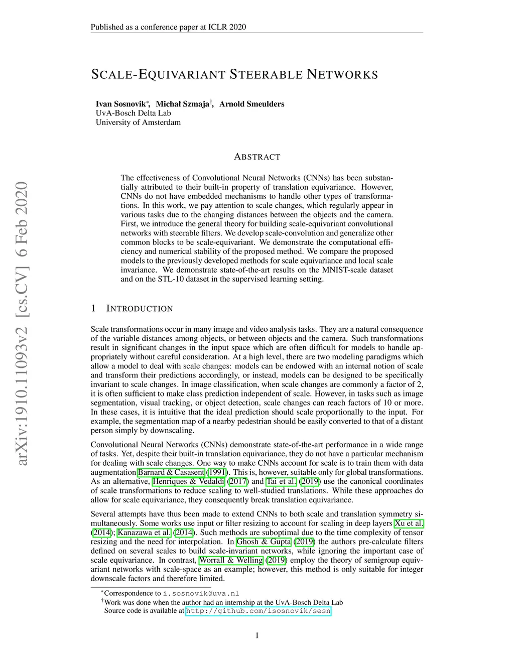 The effectiveness of Convolutional Neural Networks (CNNs) has been substantially attributed to their built-in property of translation equivariance. However, CNNs do not have embedded mechanisms to handle other types of transformations. In this work, we pay attention to scale changes, which regularly appear in various tasks due to the changing distances between the objects and the camera. First, we introduce the general theory for building scale-equivariant convolutional networks with steerable filters. We develop scale-convolution and generalize other common blocks to be scale-equivariant. We demonstrate the computational efficiency and numerical stability of the proposed method. We compare the proposed models to the previously developed methods for scale equivariance and local scale invariance. We demonstrate state-of-the-art results on MNIST-scale dataset and on STL-10 dataset in the supervised learning setting.