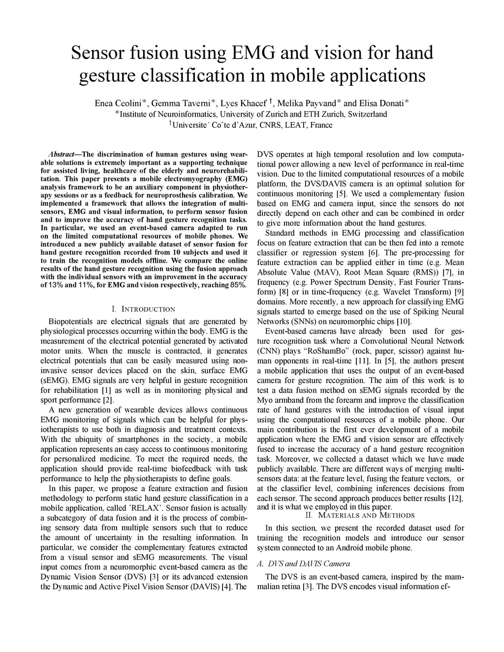The discrimination of human gestures using wearable solutions is extremely important as a supporting technique for assisted living, healthcare of the elderly and neurorehabilitation. This paper presents a mobile electromyography (EMG) analysis framework to be an auxiliary component in physiotherapy sessions or as a feedback for neuroprosthesis calibration. We implemented a framework that allows the integration of multisensors, EMG and visual information, to perform sensor fusion and to improve the accuracy of hand gesture recognition tasks. In particular, we used an event-based camera adapted to run on the limited computational resources of mobile phones. We introduced a new publicly available dataset of sensor fusion for hand gesture recognition recorded from 10 subjects and used it to train the recognition models offline. We compare the online results of the hand gesture recognition using the fusion approach with the individual sensors with an improvement in the accuracy of 13% and 11%, for EMG and vision respectively, reaching 85%.