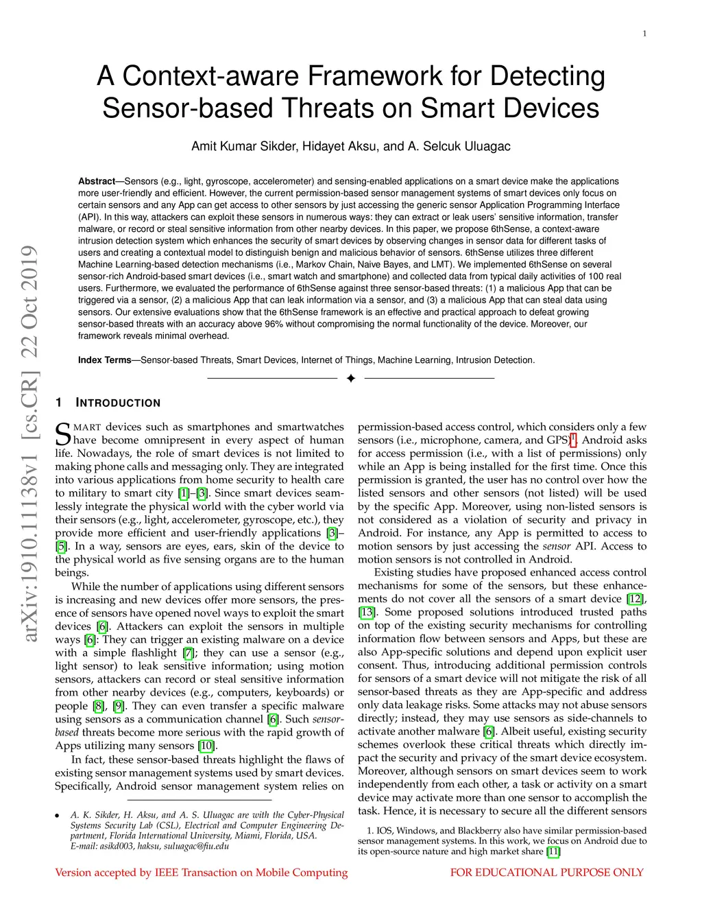 Sensors (e.g., light, gyroscope, accelerometer) and sensing-enabled applications on a smart device make the applications more user-friendly and efficient. However, the current permission-based sensor management systems of smart devices only focus on certain sensors and any App can get access to other sensors by just accessing the generic sensor Application Programming Interface (API). In this way, attackers can exploit these sensors in numerous ways: they can extract or leak users' sensitive information, transfer malware, or record or steal sensitive information from other nearby devices. In this paper, we propose 6thSense, a context-aware intrusion detection system which enhances the security of smart devices by observing changes in sensor data for different tasks of users and creating a contextual model to distinguish benign and malicious behavior of sensors. 6thSense utilizes three different Machine Learning-based detection mechanisms (i.e., Markov Chain, Naive Bayes, and LMT). We implemented 6thSense on several sensor-rich Android-based smart devices (i.e., smart watch and smartphone) and collected data from typical daily activities of 100 real users. Furthermore, we evaluated the performance of 6thSense against three sensor-based threats: (1) a malicious App that can be triggered via a sensor, (2) a malicious App that can leak information via a sensor, and (3) a malicious App that can steal data using sensors. Our extensive evaluations show that the 6thSense framework is an effective and practical approach to defeat growing sensor-based threats with an accuracy above 96% without compromising the normal functionality of the device. Moreover, our framework reveals minimal overhead.