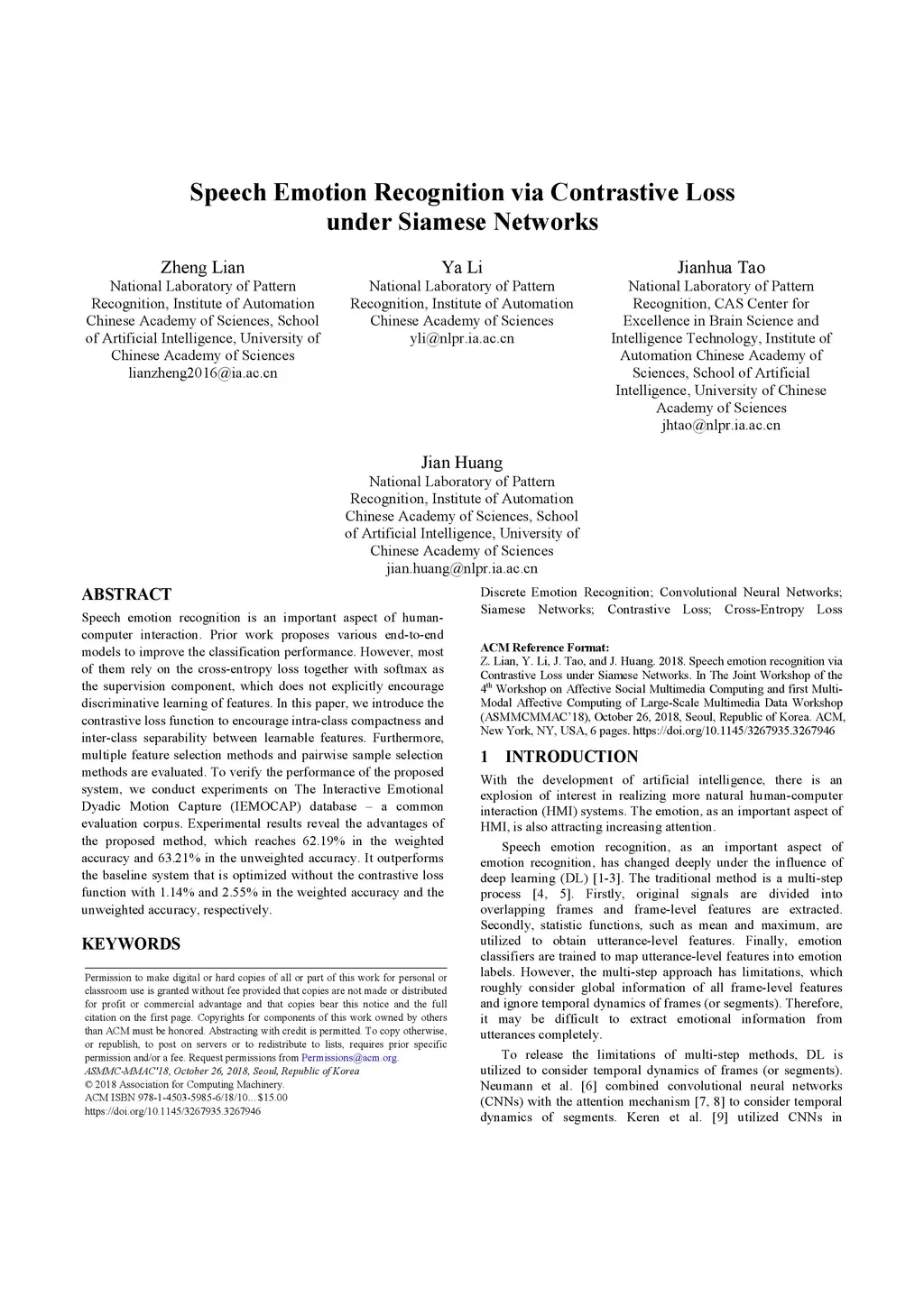 Speech Emotion Recognition via Contrastive Loss under Siamese Networks