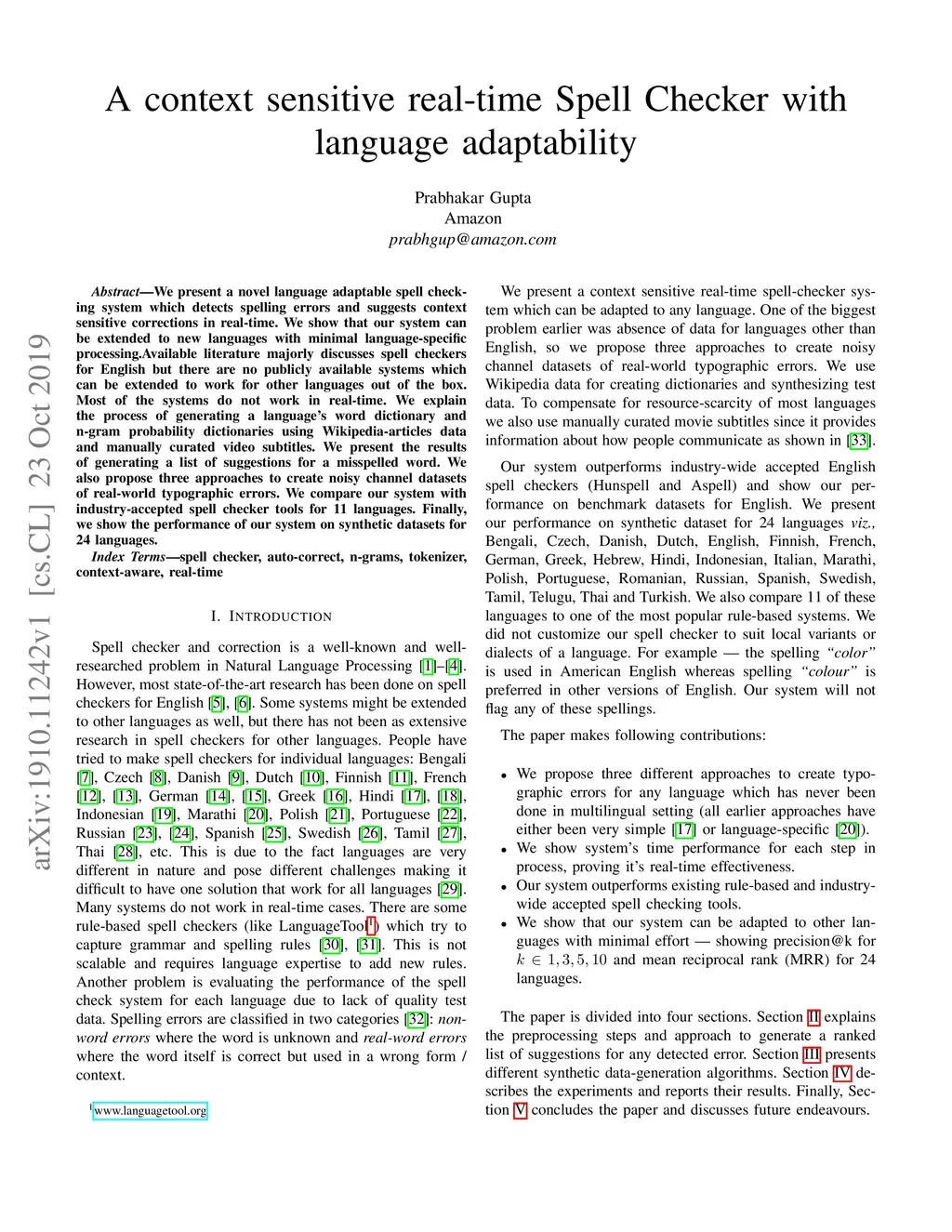 We present a novel language adaptable spell checking system which detects spelling errors and suggests context sensitive corrections in real-time. We show that our system can be extended to new languages with minimal language-specific processing. Available literature majorly discusses spell checkers for English but there are no publicly available systems which can be extended to work for other languages out of the box. Most of the systems do not work in real-time. We explain the process of generating a language's word dictionary and n-gram probability dictionaries using Wikipedia-articles data and manually curated video subtitles. We present the results of generating a list of suggestions for a misspelled word. We also propose three approaches to create noisy channel datasets of real-world typographic errors. We compare our system with industry-accepted spell checker tools for 11 languages. Finally, we show the performance of our system on synthetic datasets for 24 languages.