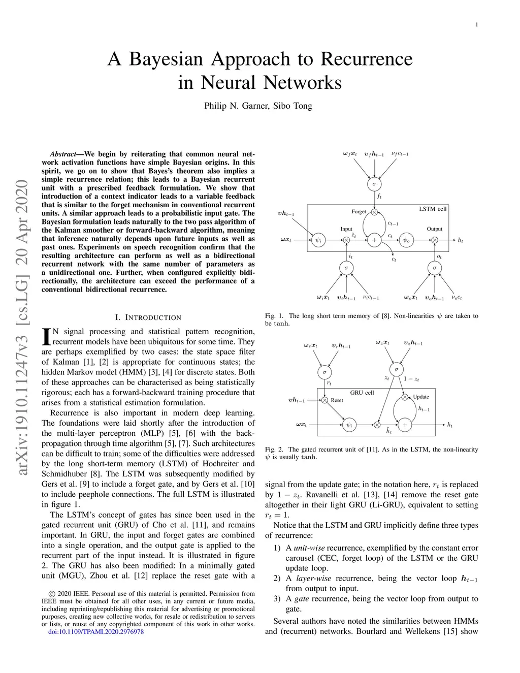 We begin by reiterating that common neural network activation functions have simple Bayesian origins. In this spirit, we go on to show that Bayes's theorem also implies a simple recurrence relation; this leads to a Bayesian recurrent unit with a prescribed feedback formulation. We show that introduction of a context indicator leads to a variable feedback that is similar to the forget mechanism in conventional recurrent units. A similar approach leads to a probabilistic input gate. The Bayesian formulation leads naturally to the two pass algorithm of the Kalman smoother or forward-backward algorithm, meaning that inference naturally depends upon future inputs as well as past ones. Experiments on speech recognition confirm that the resulting architecture can perform as well as a bidirectional recurrent network with the same number of parameters as a unidirectional one. Further, when configured explicitly bidirectionally, the architecture can exceed the performance of a conventional bidirectional recurrence.