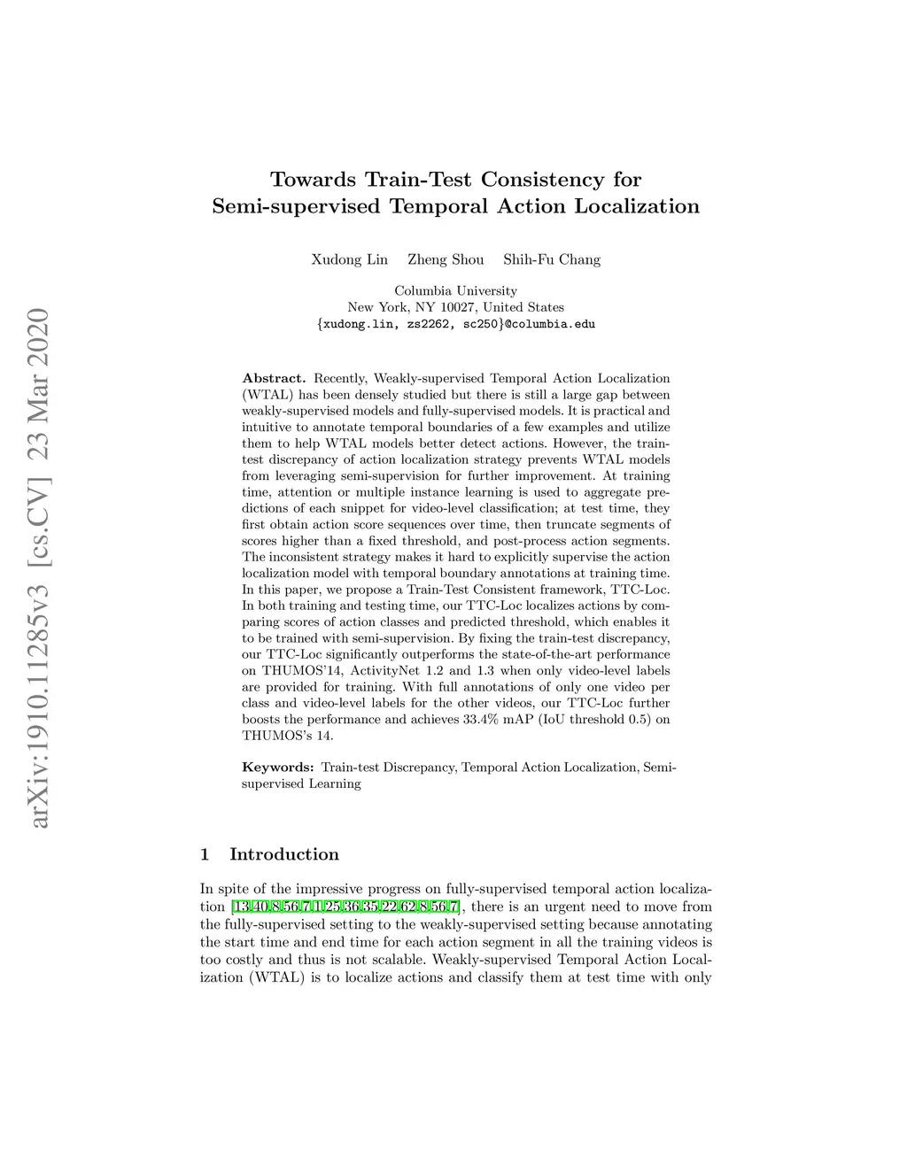 Recently, Weakly-supervised Temporal Action Localization (WTAL) has been densely studied but there is still a large gap between weakly-supervised models and fully-supervised models. It is practical and intuitive to annotate temporal boundaries of a few examples and utilize them to help WTAL models better detect actions. However, the train-test discrepancy of action localization strategy prevents WTAL models from leveraging semi-supervision for further improvement. At training time, attention or multiple instance learning is used to aggregate predictions of each snippet for video-level classification; at test time, they first obtain action score sequences over time, then truncate segments of scores higher than a fixed threshold, and post-process action segments. The inconsistent strategy makes it hard to explicitly supervise the action localization model with temporal boundary annotations at training time. In this paper, we propose a Train-Test Consistent framework, TTC-Loc. In both training and testing time, our TTC-Loc localizes actions by comparing scores of action classes and predicted threshold, which enables it to be trained with semi-supervision. By fixing the train-test discrepancy, our TTC-Loc significantly outperforms the state-of-the-art performance on THUMOS'14, ActivityNet 1.2 and 1.3 when only video-level labels are provided for training. With full annotations of only one video per class and video-level labels for the other videos, our TTC-Loc further boosts the performance and achieves 33.4\% mAP (IoU threshold 0.5) on THUMOS's 14.