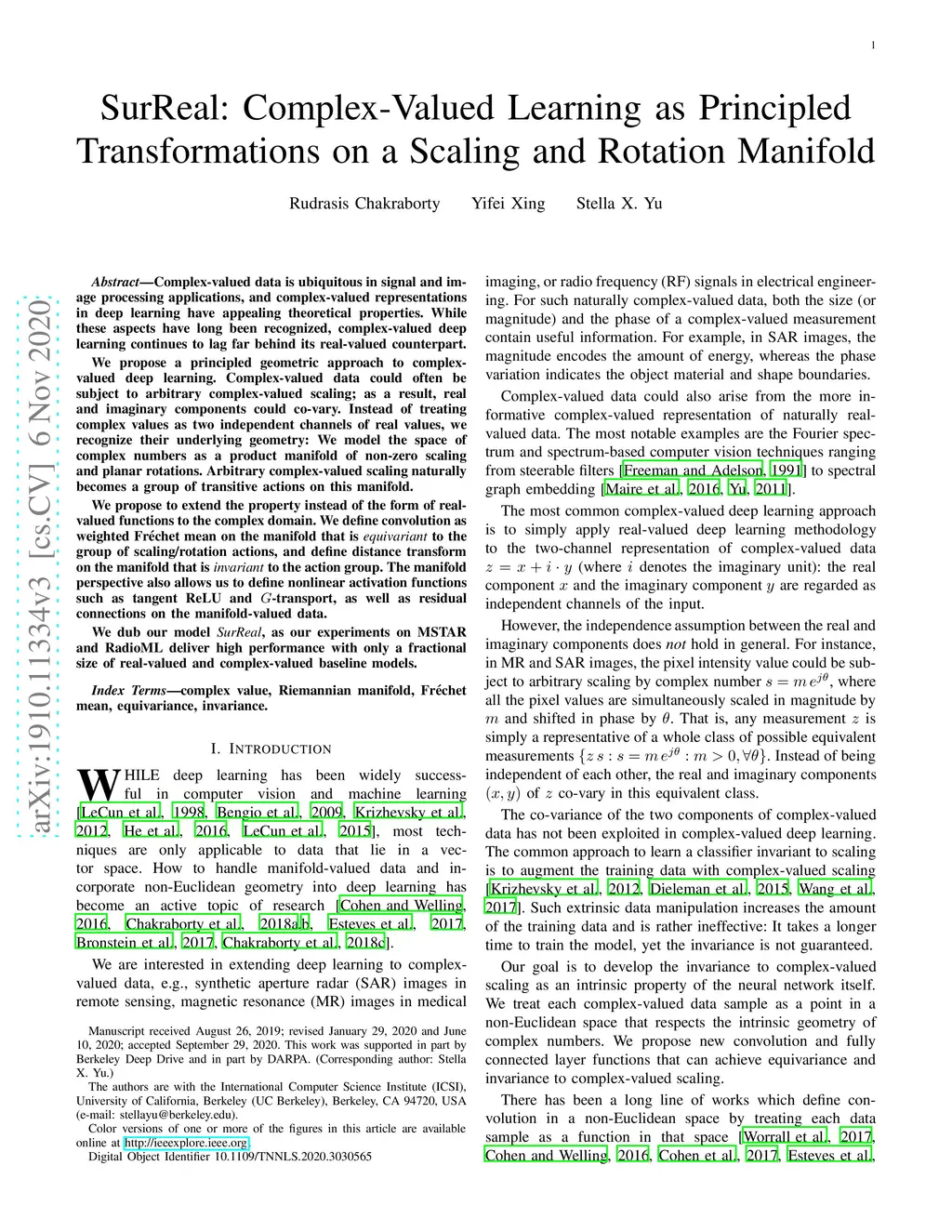 Complex-valued data is ubiquitous in signal and image processing applications, and complex-valued representations in deep learning have appealing theoretical properties. While these aspects have long been recognized, complex-valued deep learning continues to lag far behind its real-valued counterpart. We propose a principled geometric approach to complex-valued deep learning. Complex-valued data could often be subject to arbitrary complex-valued scaling; as a result, real and imaginary components could co-vary. Instead of treating complex values as two independent channels of real values, we recognize their underlying geometry: We model the space of complex numbers as a product manifold of non-zero scaling and planar rotations. Arbitrary complex-valued scaling naturally becomes a group of transitive actions on this manifold. We propose to extend the property instead of the form of real-valued functions to the complex domain. We define convolution as weighted Fr\échet mean on the manifold that is equivariant to the group of scaling/rotation actions, and define distance transform on the manifold that is invariant to the action group. The manifold perspective also allows us to define nonlinear activation functions such as tangent ReLU and G-transport, as well as residual connections on the manifold-valued data. We dub our model SurReal, as our experiments on MSTAR and RadioML deliver high performance with only a fractional size of real-valued and complex-valued baseline models.