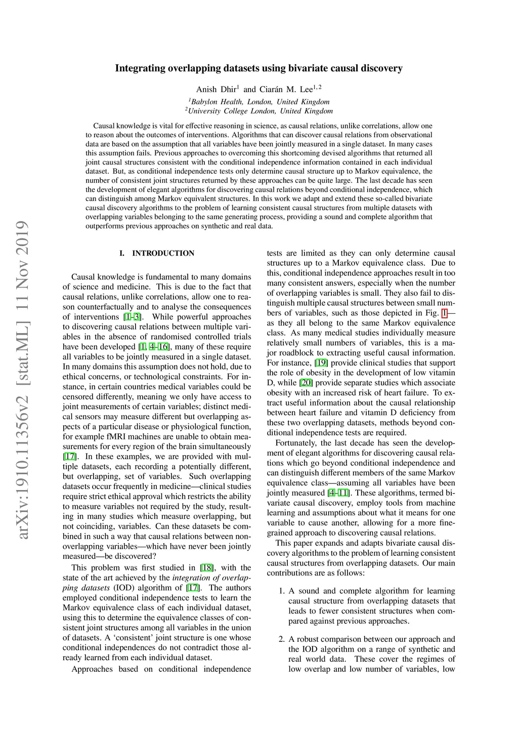 Causal knowledge is vital for effective reasoning in science, as causal relations, unlike correlations, allow one to reason about the outcomes of interventions. Algorithms that can discover causal relations from observational data are based on the assumption that all variables have been jointly measured in a single dataset. In many cases this assumption fails. Previous approaches to overcoming this shortcoming devised algorithms that returned all joint causal structures consistent with the conditional independence information contained in each individual dataset. But, as conditional independence tests only determine causal structure up to Markov equivalence, the number of consistent joint structures returned by these approaches can be quite large. The last decade has seen the development of elegant algorithms for discovering causal relations beyond conditional independence, which can distinguish among Markov equivalent structures. In this work we adapt and extend these so-called bivariate causal discovery algorithms to the problem of learning consistent causal structures from multiple datasets with overlapping variables belonging to the same generating process, providing a sound and complete algorithm that outperforms previous approaches on synthetic and real data.