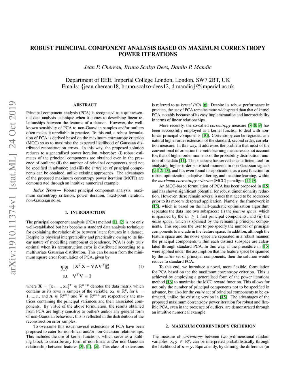 Principal component analysis (PCA) is recognised as a quintessential data analysis technique when it comes to describing linear relationships between the features of a dataset. However, the well-known sensitivity of PCA to non-Gaussian samples and/or outliers often makes it unreliable in practice. To this end, a robust formulation of PCA is derived based on the maximum correntropy criterion (MCC) so as to maximise the expected likelihood of Gaussian distributed reconstruction errors. In this way, the proposed solution reduces to a generalised power iteration, whereby: (i) robust estimates of the principal components are obtained even in the presence of outliers; (ii) the number of principal components need not be specified in advance; and (iii) the entire set of principal components can be obtained, unlike existing approaches. The advantages of the proposed maximum correntropy power iteration (MCPI) are demonstrated through an intuitive numerical example.