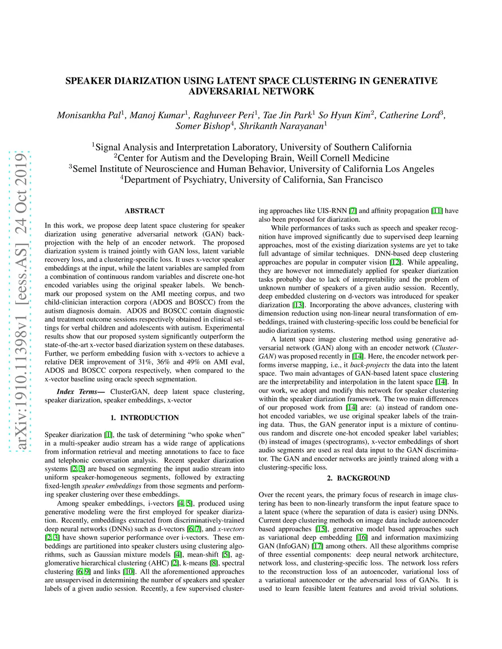 In this work, we propose deep latent space clustering for speaker diarization using generative adversarial network (GAN) backprojection with the help of an encoder network. The proposed diarization system is trained jointly with GAN loss, latent variable recovery loss, and a clustering-specific loss. It uses x-vector speaker embeddings at the input, while the latent variables are sampled from a combination of continuous random variables and discrete one-hot encoded variables using the original speaker labels. We benchmark our proposed system on the AMI meeting corpus, and two child-clinician interaction corpora (ADOS and BOSCC) from the autism diagnosis domain. ADOS and BOSCC contain diagnostic and treatment outcome sessions respectively obtained in clinical settings for verbal children and adolescents with autism. Experimental results show that our proposed system significantly outperform the state-of-the-art x-vector based diarization system on these databases. Further, we perform embedding fusion with x-vectors to achieve a relative DER improvement of 31%, 36% and 49% on AMI eval, ADOS and BOSCC corpora respectively, when compared to the x-vector baseline using oracle speech segmentation.