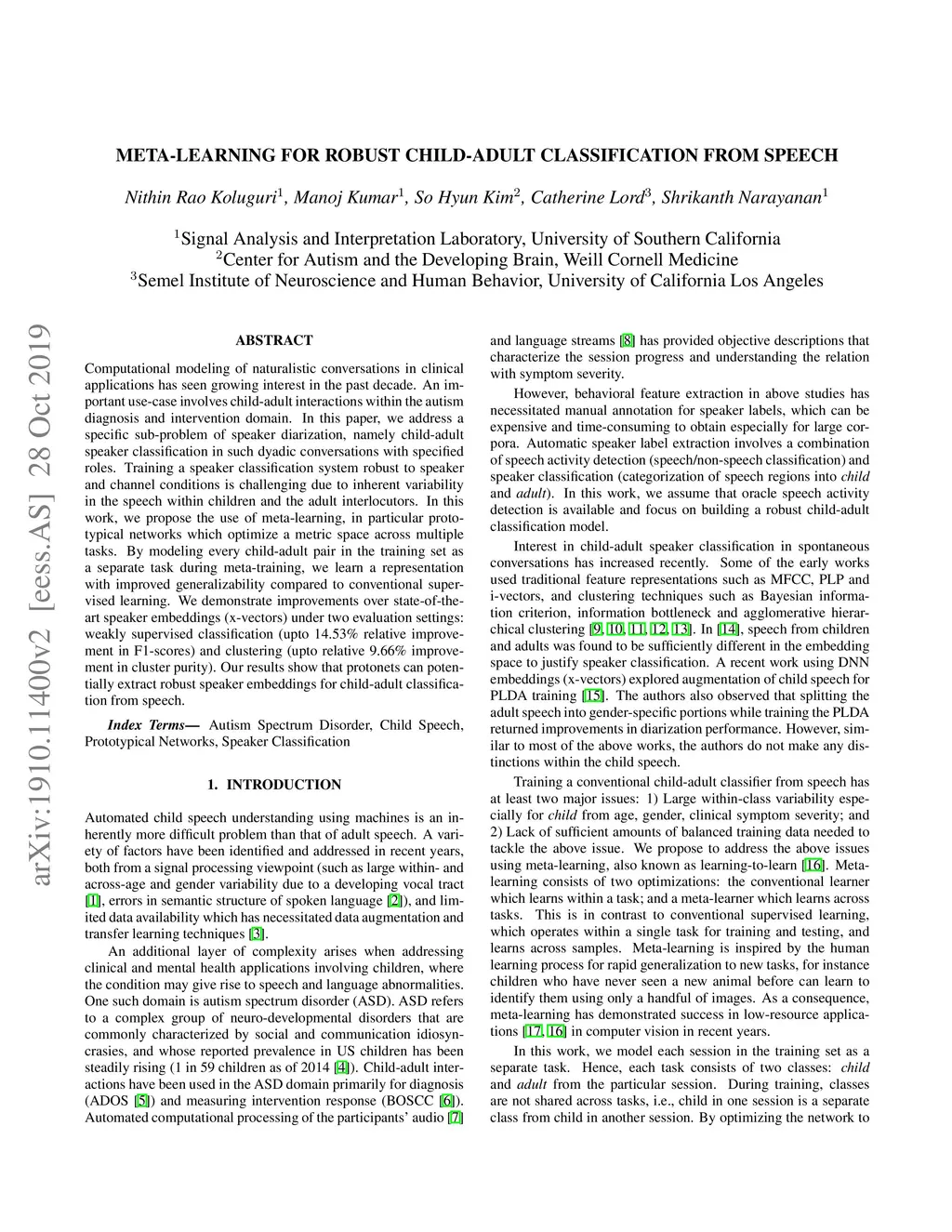 Computational modeling of naturalistic conversations in clinical applications has seen growing interest in the past decade. An important use-case involves child-adult interactions within the autism diagnosis and intervention domain. In this paper, we address a specific sub-problem of speaker diarization, namely child-adult speaker classification in such dyadic conversations with specified roles. Training a speaker classification system robust to speaker and channel conditions is challenging due to inherent variability in the speech within children and the adult interlocutors. In this work, we propose the use of meta-learning, in particular, prototypical networks which optimize a metric space across multiple tasks. By modeling every child-adult pair in the training set as a separate task during meta-training, we learn a representation with improved generalizability compared to conventional supervised learning. We demonstrate improvements over state-of-the-art speaker embeddings (x-vectors) under two evaluation settings: weakly supervised classification (up to 14.53% relative improvement in F1-scores) and clustering (up to relative 9.66% improvement in cluster purity). Our results show that protonets can potentially extract robust speaker embeddings for child-adult classification from speech.