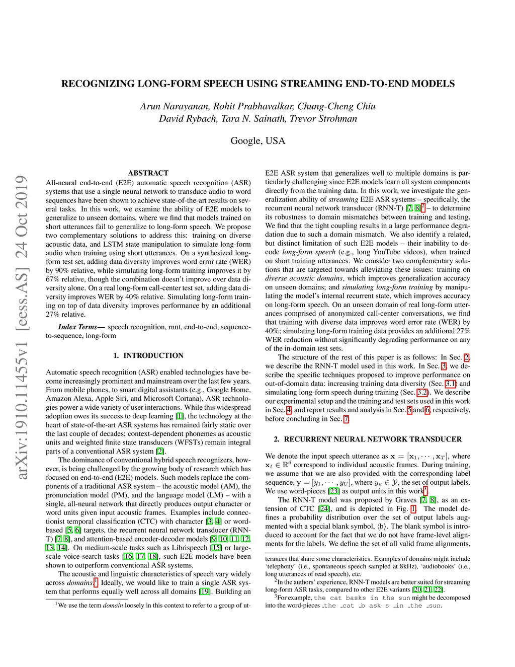 Recognizing long-form speech using streaming end-to-end models