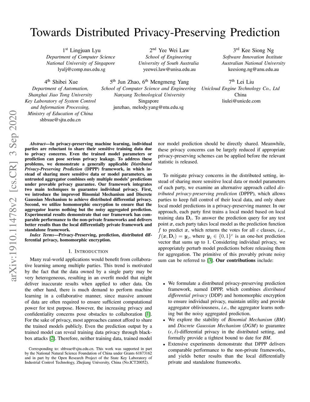 In privacy-preserving machine learning, individual parties are reluctant to share their sensitive training data due to privacy concerns. Even the trained model parameters or prediction can pose serious privacy leakage. To address these problems, we demonstrate a generally applicable Distributed Privacy-Preserving Prediction (DPPP) framework, in which instead of sharing more sensitive data or model parameters, an untrusted aggregator combines only multiple models' predictions under provable privacy guarantee. Our framework integrates two main techniques to guarantee individual privacy. First, we introduce the improved Binomial Mechanism and Discrete Gaussian Mechanism to achieve distributed differential privacy. Second, we utilize homomorphic encryption to ensure that the aggregator learns nothing but the noisy aggregated prediction. Experimental results demonstrate that our framework has comparable performance to the non-private frameworks and delivers better results than the local differentially private framework and standalone framework.