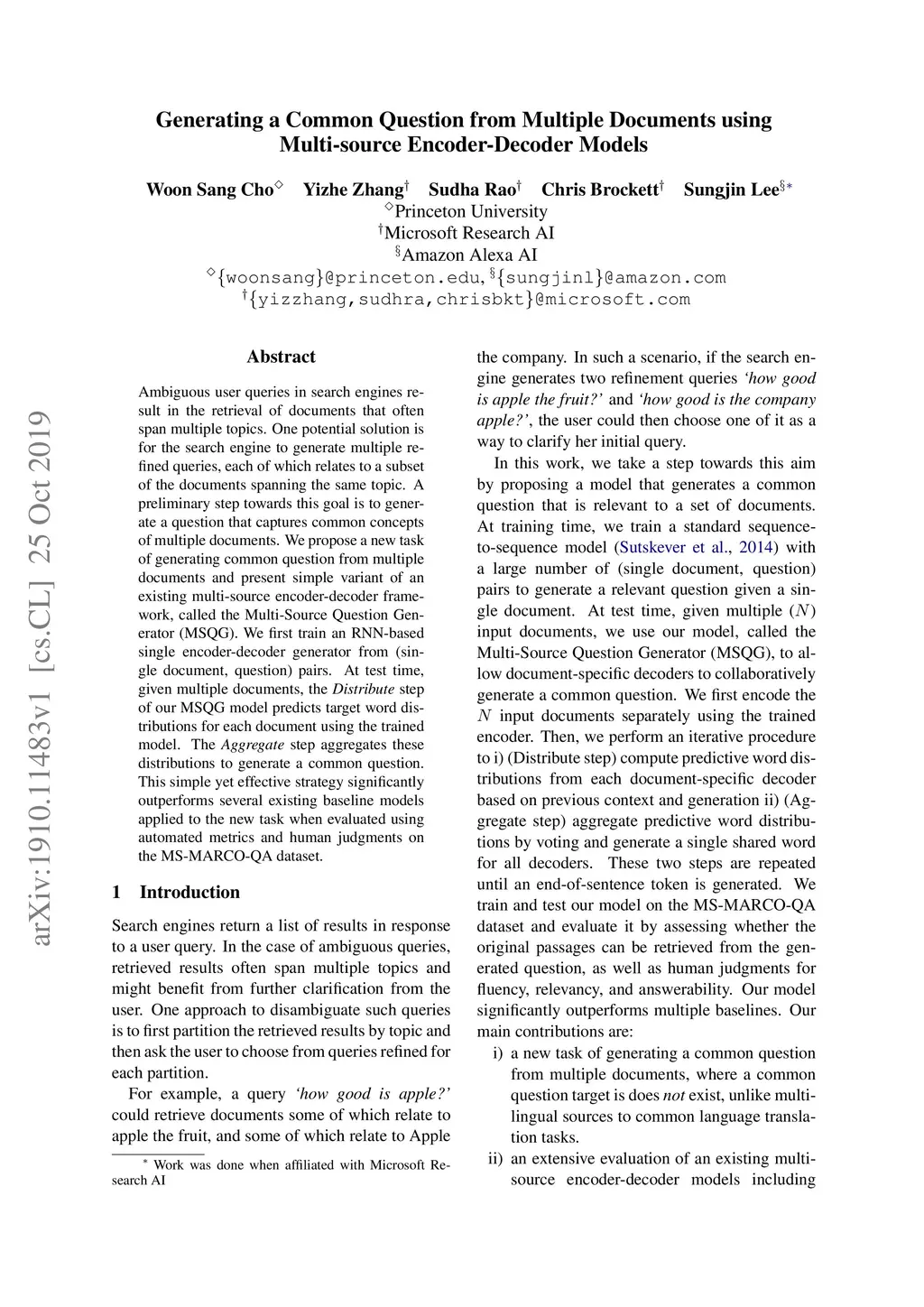 Ambiguous user queries in search engines result in the retrieval of documents that often span multiple topics. One potential solution is for the search engine to generate multiple refined queries, each of which relates to a subset of the documents spanning the same topic. A preliminary step towards this goal is to generate a question that captures common concepts of multiple documents. We propose a new task of generating common question from multiple documents and present simple variant of an existing multi-source encoder-decoder framework, called the Multi-Source Question Generator (MSQG). We first train an RNN-based single encoder-decoder generator from (single document, question) pairs. At test time, given multiple documents, the 'Distribute' step of our MSQG model predicts target word distributions for each document using the trained model. The Ággregate' step aggregates these distributions to generate a common question. This simple yet effective strategy significantly outperforms several existing baseline models applied to the new task when evaluated using automated metrics and human judgments on the MS-MARCO-QA dataset.