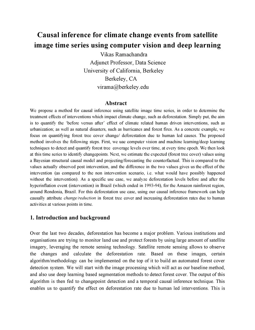 We propose a method for causal inference using satellite image time series, in order to determine the treatment effects of interventions which impact climate change, such as deforestation. Simply put, the aim is to quantify the 'before versus after' effect of climate related human driven interventions, such as urbanization; as well as natural disasters, such as hurricanes and forest fires. As a concrete example, we focus on quantifying forest tree cover change/ deforestation due to human led causes. The proposed method involves the following steps. First, we uae computer vision and machine learning/deep learning techniques to detect and quantify forest tree coverage levels over time, at every time epoch. We then look at this time series to identify changepoints. Next, we estimate the expected (forest tree cover) values using a Bayesian structural causal model and projecting/forecasting the counterfactual. This is compared to the values actually observed post intervention, and the difference in the two values gives us the effect of the intervention (as compared to the non intervention scenario, i.e. what would have possibly happened without the intervention). As a specific use case, we analyze deforestation levels before and after the hyperinflation event (intervention) in Brazil (which ended in 1993-94), for the Amazon rainforest region, around Rondonia, Brazil. For this deforestation use case, using our causal inference framework can help causally attribute change/reduction in forest tree cover and increasing deforestation rates due to human activities at various points in time.