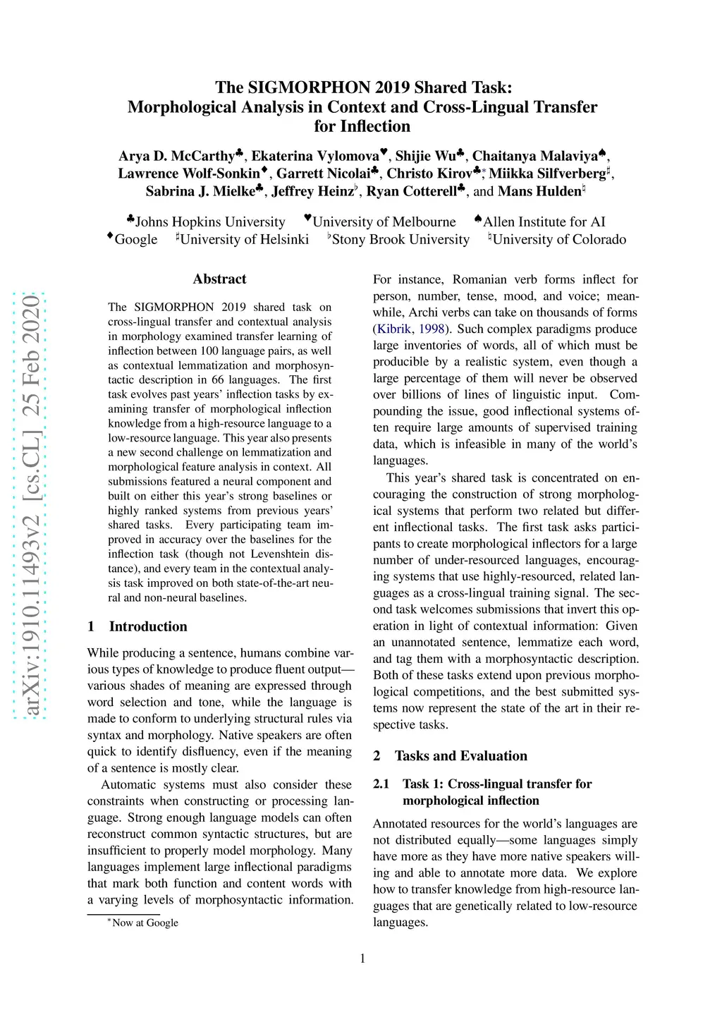 The SIGMORPHON 2019 Shared Task: Morphological Analysis in Context and